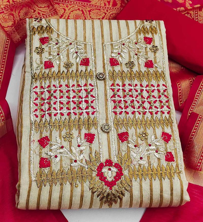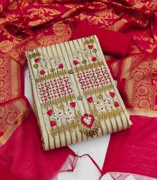 Beige cotton embroidered dress material unstitched