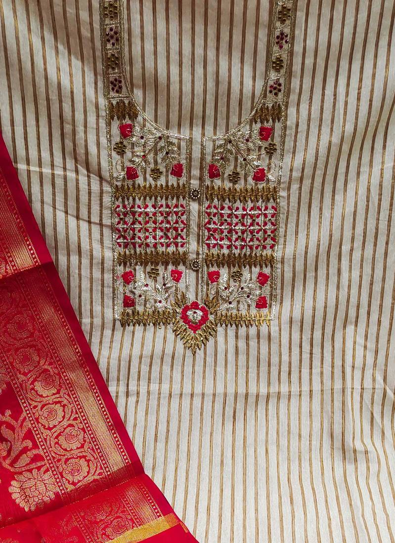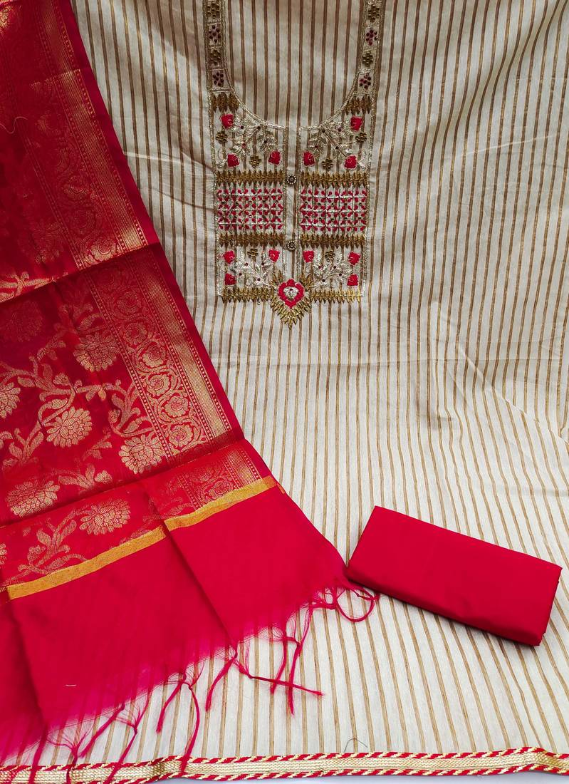 | Product Description | Heavy Multi Zari Embroidery With Fancy Border And Weaving Dupatta Straight Style 1.80 Mtr Unstitched Dress Material Top Of Beige Colour Cambric Cotton Fabric Suggestable Quarter Style Sleeves And Round Style Neck Also Including 2.00 Mtr Chudidar Style Bottom Piece Material Of Red Colour Cotton Fabric With 2.00 Mtr Dupatta Of Red Colour Banarasi Jacquard Fabric |