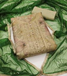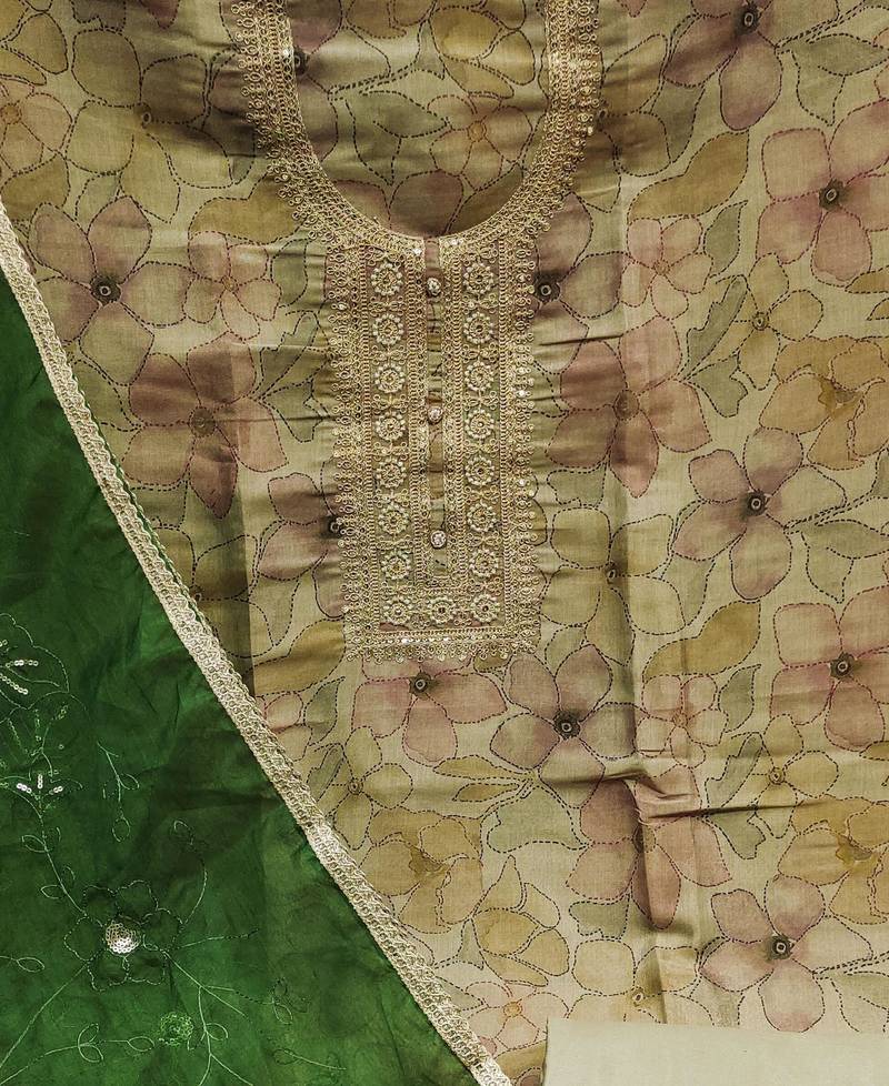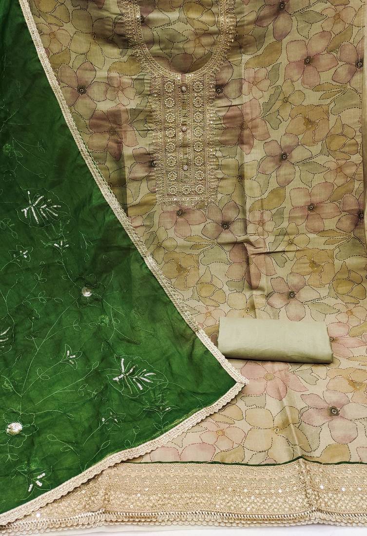 | Product Description | Fancy Digital Print Handwork And Fancy Border With Embroidered Dupatta Straight Style 1.90 Mtr Unstitched Dress Material Top Of Beige Colour Simmar Cotton Fabric With 2 Mtr Santoon As Lining Inner Fabric Also Including 3.60 Mtr Unstitched Bottom Material Of Olive Green Colour Santoon Fabric With 2.00 Mtr Dupatta Of Green Colour Organza Fabric |