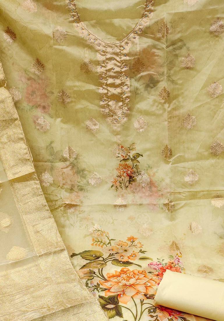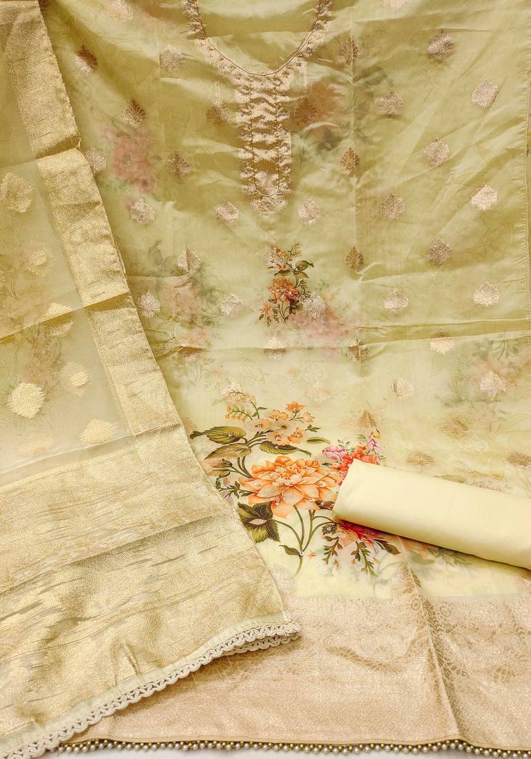 | Product Description | Weaving Digital Print And Fancy Handwork With Banarasi Dupatta Straight Style 2.00 Mtr Unstitched Dress Material Top Of Beige Colour Viscose Organza Fabric With 2 Mtr Pure Cotton As Lining Inner Fabric Also Including 3.80 Mtr Unstitched Bottom Material Of Beige Colour Pure Cotton Fabric With 2.00 Mtr Dupatta Of Beige Colour Organza Banarasi Fabric |