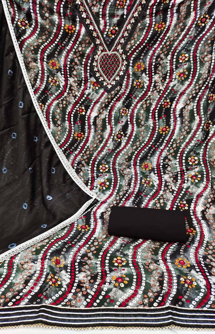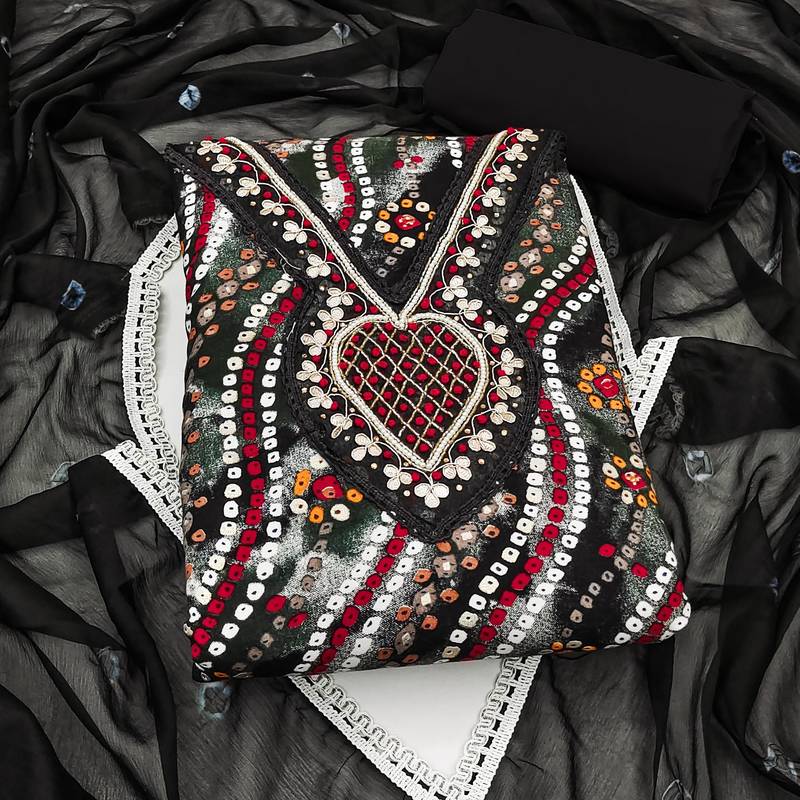 | Product Description | Lahariya Print Handwork And Fancy Border With Printed Dupatta Straight Style 1.90 Mtr Unstitched Dress Material Top Of Black Colour Jam Coton Fabric Also Including 2.10 Mtr Chudidar Style Bottom Piece Material Of Black Colour Cotton Fabric With 2.00 Mtr Dupatta Of Black Colour Nazneen Fabric |