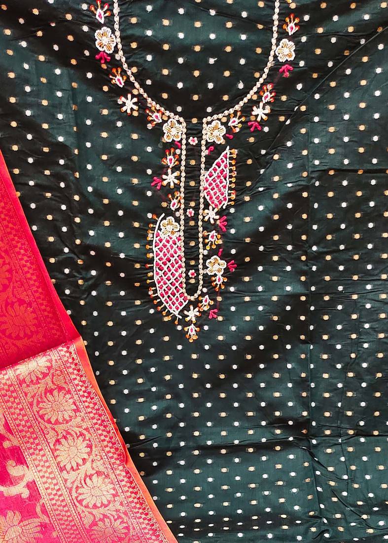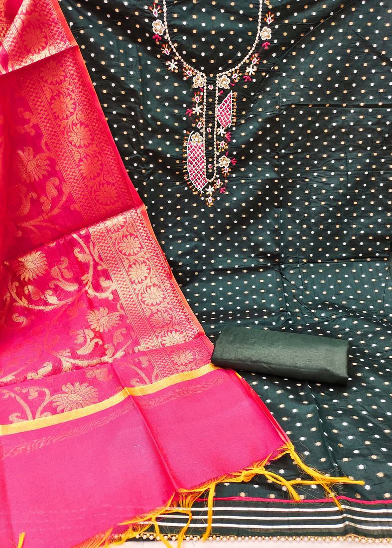 | Product Description | Weaving Handwork And Border With Fancy Banarasi Dupatta Straight Style 2.00 Mtr Unstitched Dress Material Top Of Black Colour Modal Butti Cotton Fabric With 2 Mtr Dull Santoon As Lining Inner Fabric Also Including 3.80 Mtr Unstitched Bottom Material Of Black Colour Dull Santoon Fabric With 2.00 Mtr Dupatta Of Pink Colour Banarasi Fabric |