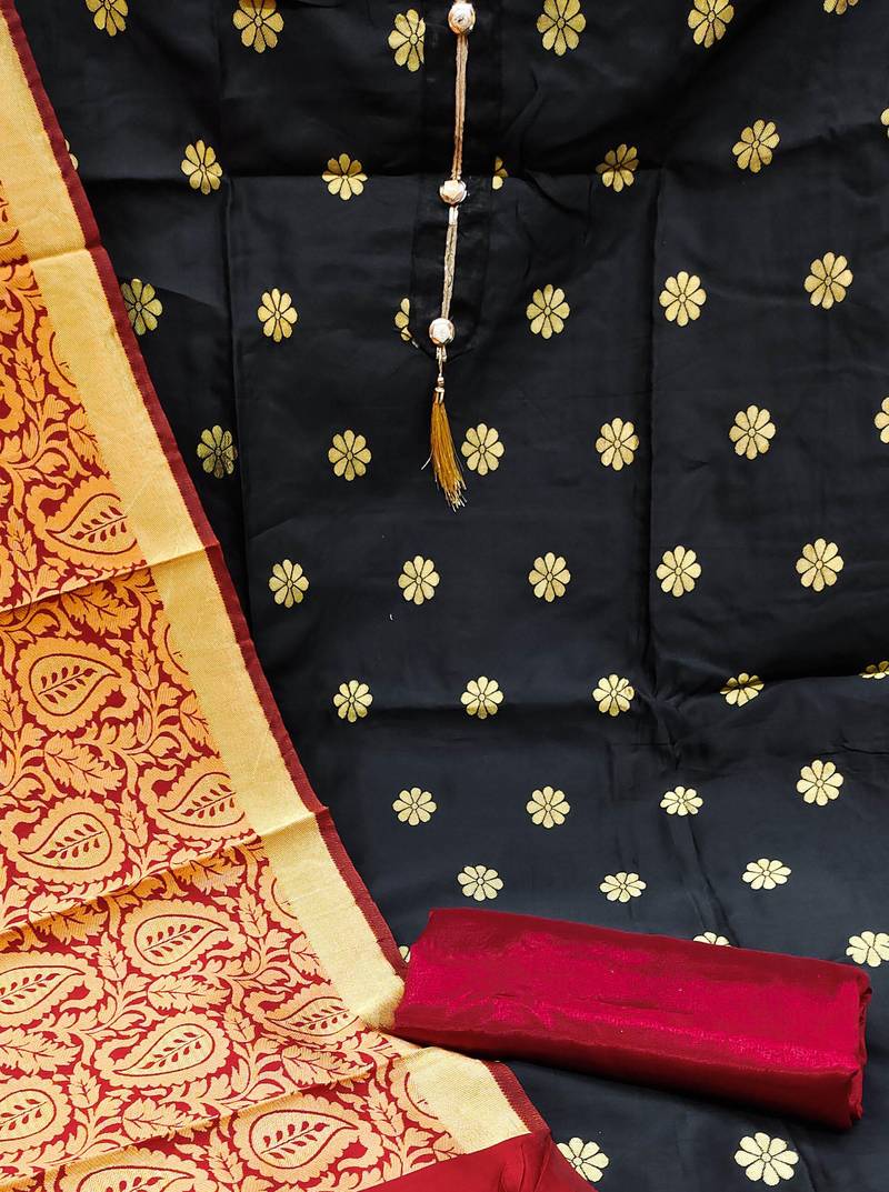 | Product Description | Weaving Straight Style 2.00 Mtr Unstitched Dress Material Top Of Black Colour Banarasi Jacquard Fabric With 2 Mtr Santoon As Lining Inner Fabric Also Including 2.10 Mtr Unstitched Bottom Material Of Maroon Colour Santoon Fabric With 2.00 Mtr Dupatta Of Maroon Colour Banarasi Jacquard Fabric |