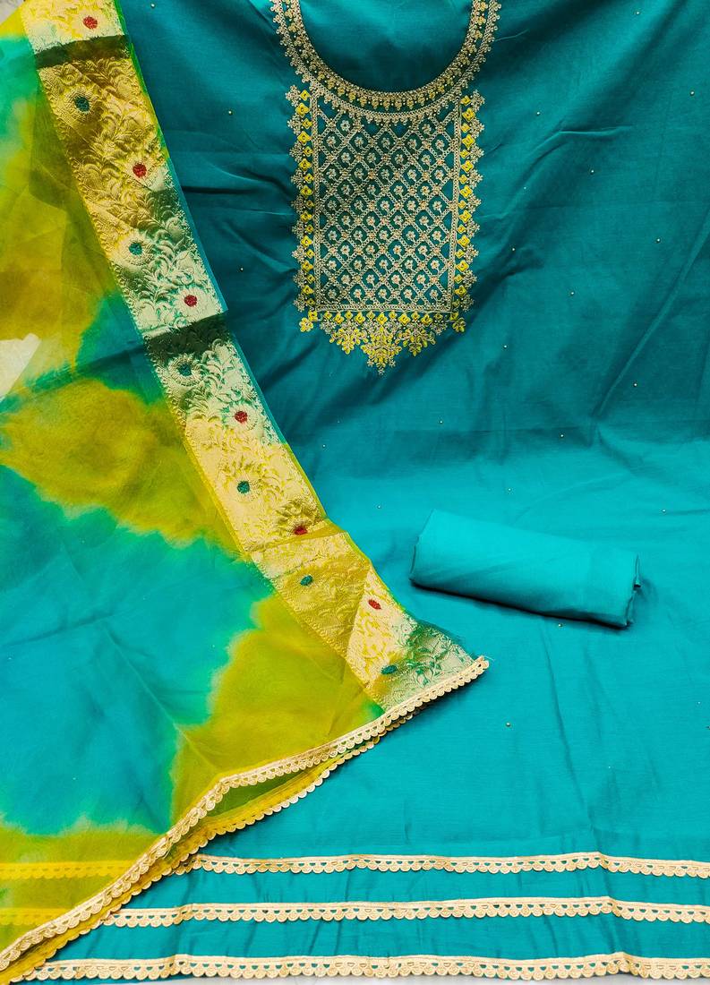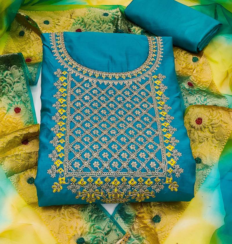 | Product Description | Heavy Multi Zari Embroidery Moti Work With Fancy Border And Printed Dupatta Straight Style 2.00 Mtr Unstitched Dress Material Top Of Blue Colour Modal Chanderi Fabric With 2 Mtr Santoon As Lining Inner Fabric Also Including 2.10 Mtr Unstitched Bottom Material Of Blue Colour Santoon Fabric With 2.00 Mtr Dupatta Of Multi Colour Tissue Organza Fabric |