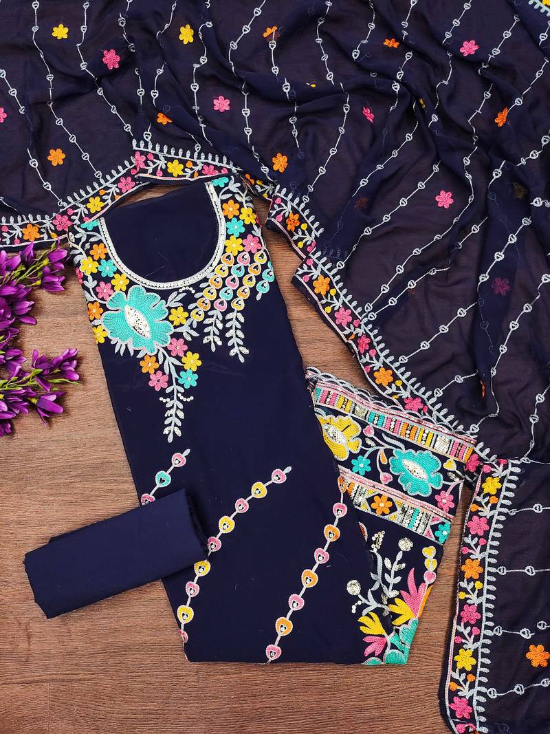 Blue georgette embroidered dress material unstitched