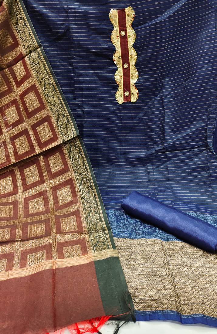 | Product Description | Weaving With Fancy Dupatta Straight Style 1.80 Mtr Unstitched Dress Material Top Of Blue Colour Banarasi Jacquard Fabric Suggestable Quarter Style Sleeves And Round Style Neck Also Including 2.00 Mtr Chudidar Style Bottom Material Of Blue Colour Santoon Fabric With 2.00 Mtr Dupatta Of Multi Colour Banarasi Fabric |