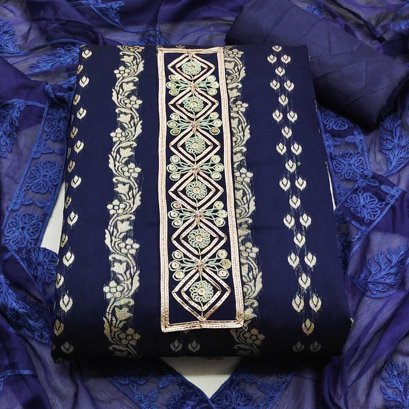 | Product Description | Appealing Fancy Hand Work And Weaving With Embroidered Dupatta Straight Style 1.80 Mtr Unstitched Dress Material Top Of Blue Colour Banarasi Jacquard Fabric With 2 Mtr Santoon As Lining Inner Fabric Also Including 2.00 Mtr Unstitched Bottom Material Of Blue Colour Santoon Fabric With 2.00 Mtr Dupatta Of Blue Colour Nazneen Fabric |