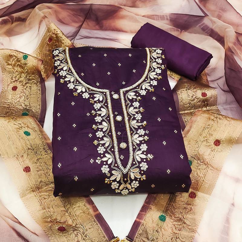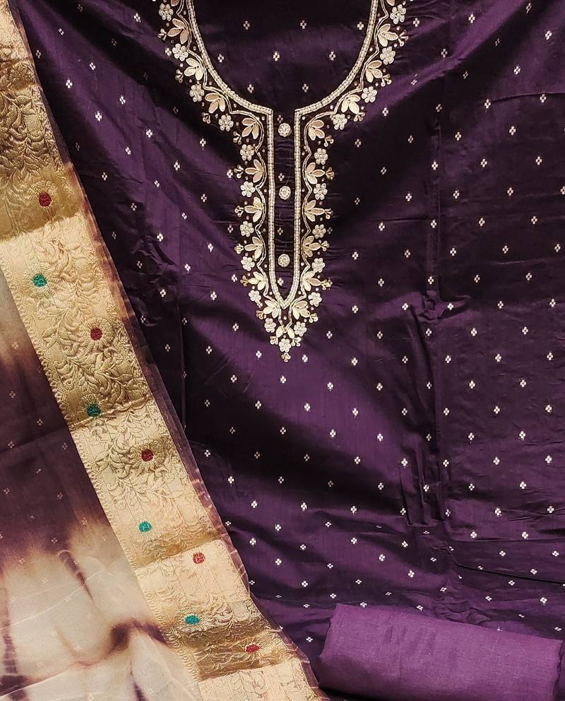 | Product Description | Banarasi Jari Weaving Work And Heavy Handwork With Printed Dupatta Straight Style 1.95 Mtr Unstitched Dress Material Top Of Burgundy Colour Cotton Jacquard Fabric With 2 Mtr Heavy Santoon As Lining Inner Fabric Also Including 3.80 Mtr Unstitched Bottom Material Of Burgundy Colour Heavy Santoon Fabric With 2.05 Mtr Dupatta Of Multi Colour Organza Jacquard Fabric |