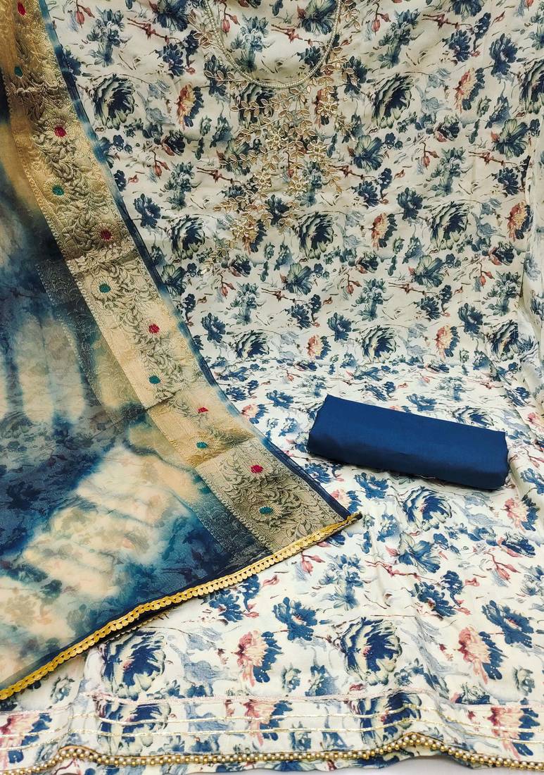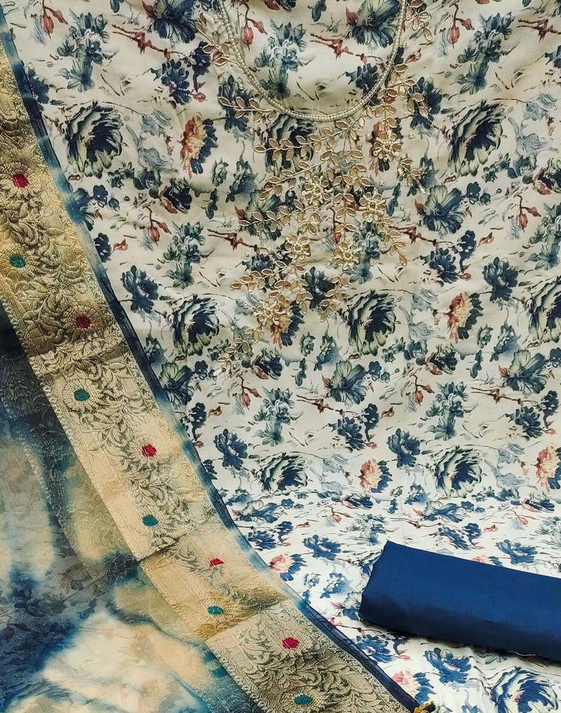 Simplistic Handwork And Print Work With Fancy Weaving Work Dupatta Straight Style 1.95 Mtr Unstitched Dress Material Top Of Cream Colour Jam Cotton Fabric Also Including 2.50 Mtr Chudidar Style Bottom Piece Material Of Blue Colour Pure Cotton Fabric With 2.05 Mtr Dupatta Of Multi Colour Organza Jacquard Fabric