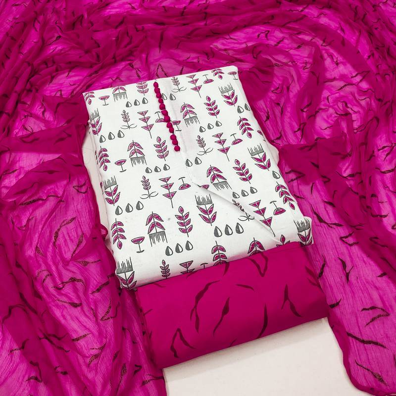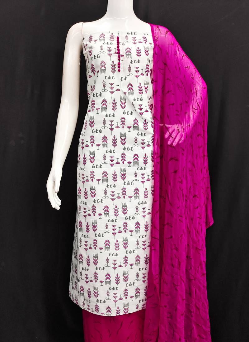 | Product Description | Print Straight Style 1.80 Mtr Unstitched Dress Material Top Of Cream Colour Slub Cotton Fabric Also Including 2.00 Mtr Chudidar Style Bottom Piece Material Of Magenta Colour Cotton Fabric With 2.00 Mtr Dupatta Of Magenta Colour Nazneen Fabric |