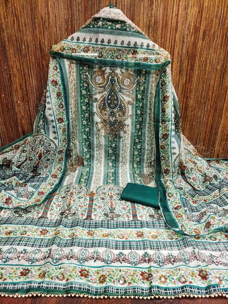 Green organza digital print dress material unstitched