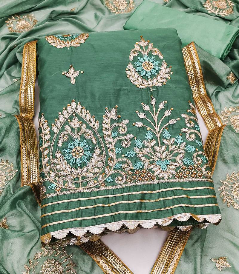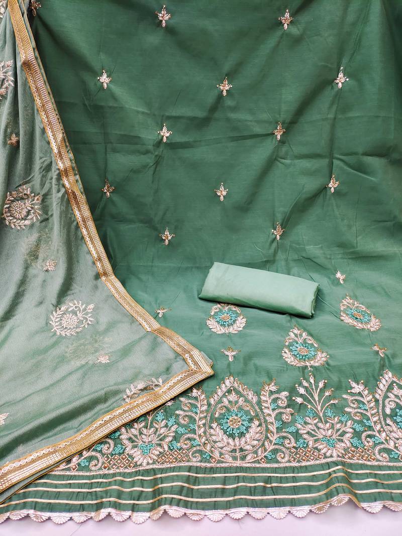 Green chanderi embroidered dress material unstitched