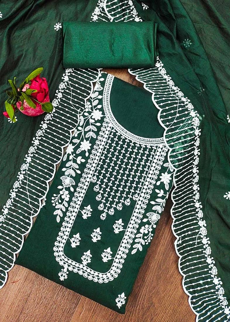 | Product Description | Heavy Thread Embroidery With Neck And Daman Work With Fancy Embroidered Dupatta Work Straight Style 2.00 Mtr Unstitched Dress Material Top Of Green Colour Chanderi Cotton Fabric With 2 Mtr Heavy Santoon As Lining Inner Fabric Also Including 3.60 Mtr Unstitched Bottom Material Of Green Colour Heavy Santoon Fabric With 2.20 Mtr Dupatta Of Green Colour Chanderi Cotton Fabric |