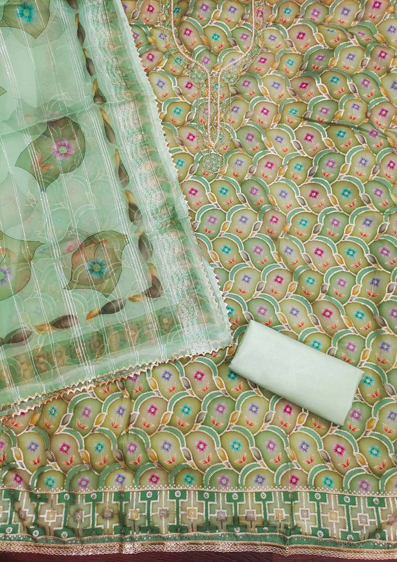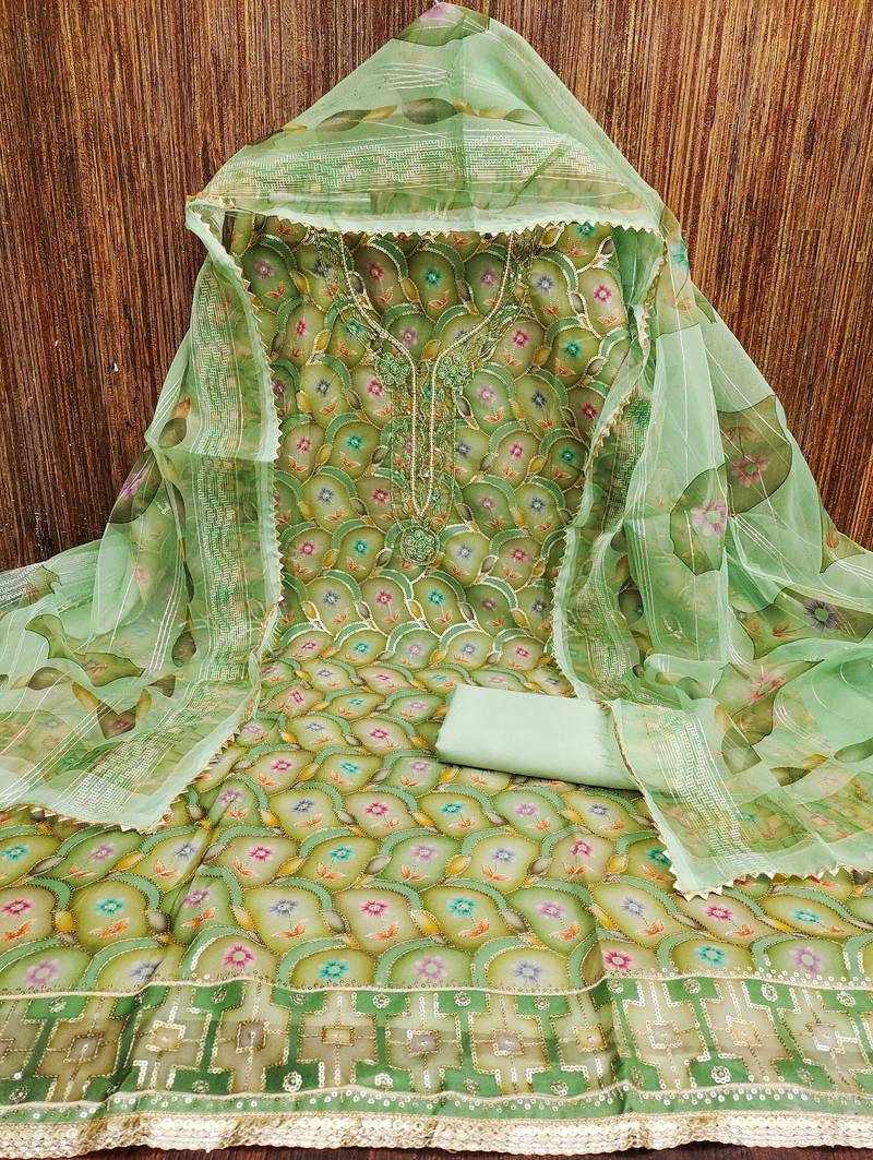 | Product Description | Digital Position Print Thread Sequin Embroidery And Fancy Border With Embroidered Dupatta Straight Style 2.00 Mtr Unstitched Dress Material Top Of Green Colour Organza Fabric With 2 Mtr Santoon As Lining Inner Fabric Also Including 3.80 Mtr Unstitched Bottom Material Of Green Colour Santoon Fabric With 2.10 Mtr Dupatta Of Green Colour Organza Fabric |