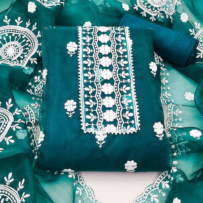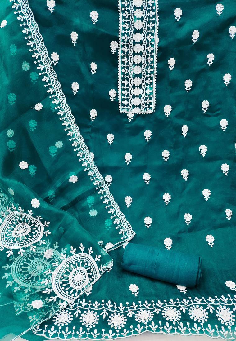 Green organza embroidered dress material unstitched