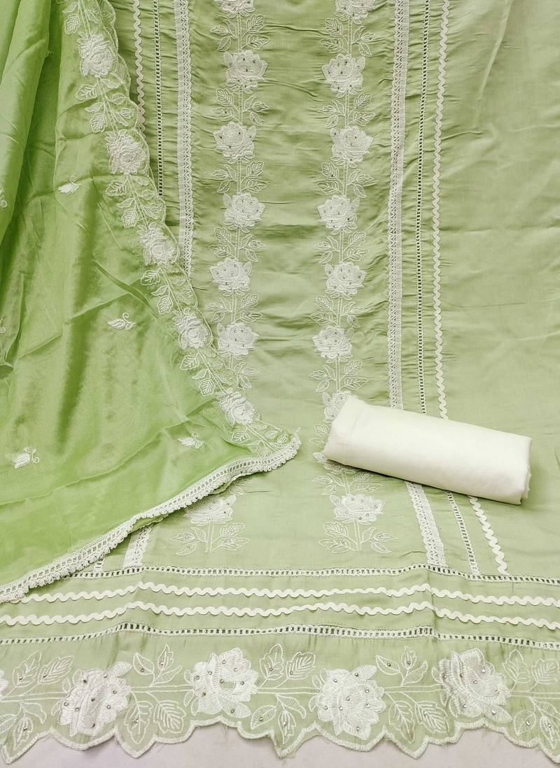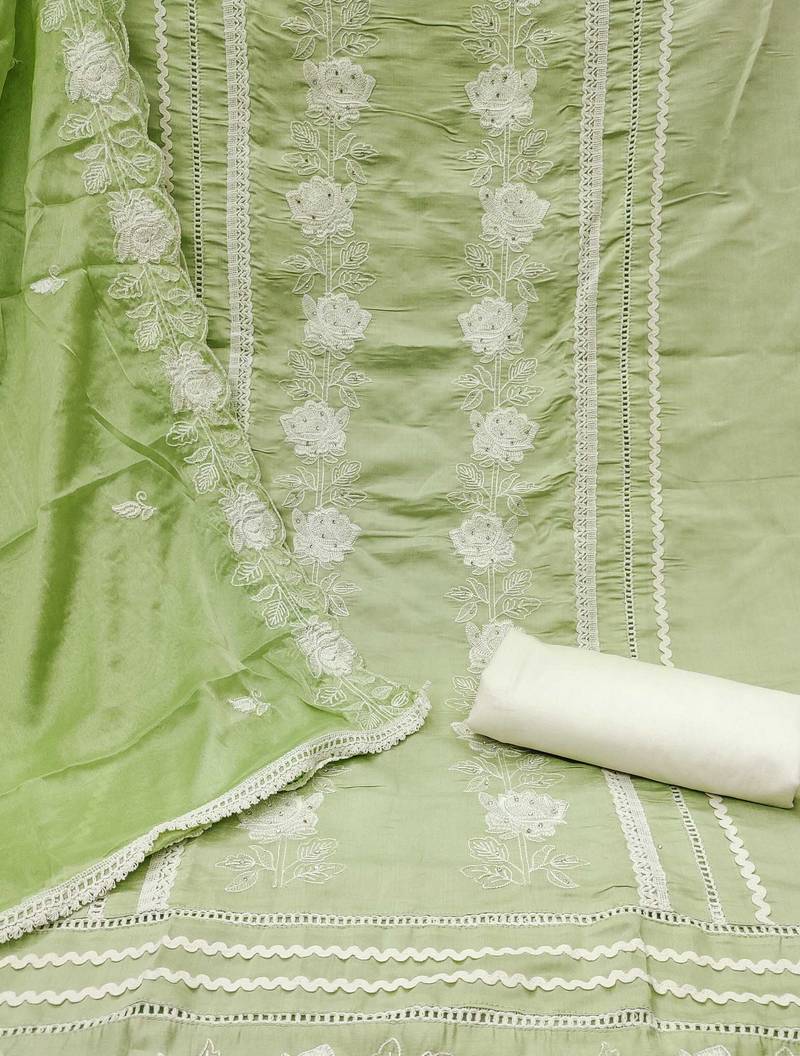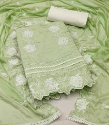 Green silk blend embroidered dress material unstitched