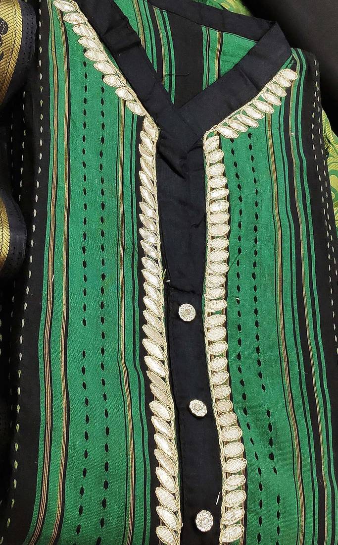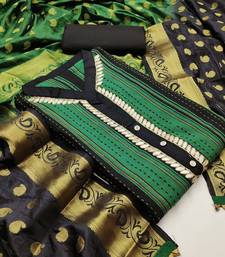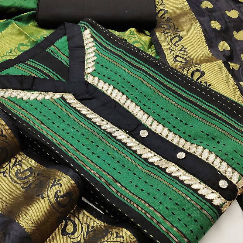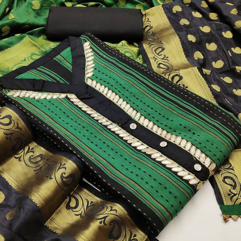 | Product Description | Fancy Hand Work With Banarasi Jacquard Dupatta Straight Style 2.00 Mtr Unstitched Dress Material Top Of Green Colour Cotton Fabric Suggestable Quarter Style Sleeves And Round Style Neck Also Including 2.10 Mtr Chudidar Style Bottom Piece Material Of Black Colour Cotton Fabric With 2.00 Mtr Dupatta Of Multi Colour Banarasi Jacquard Fabric |