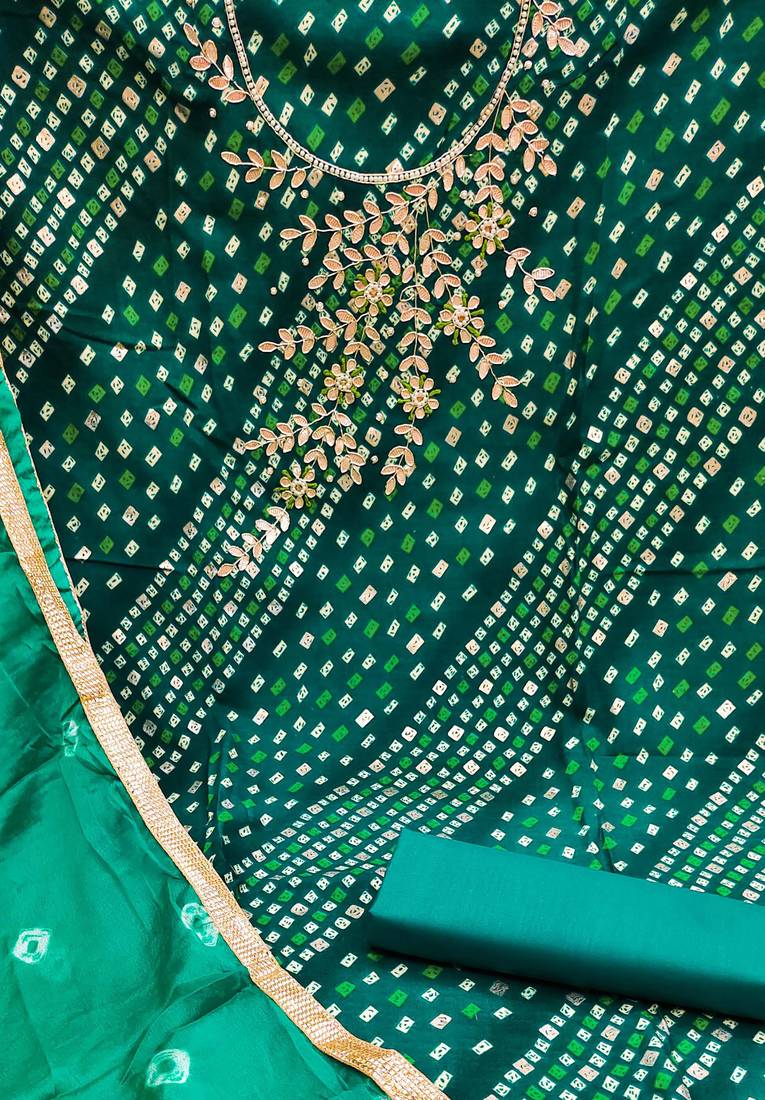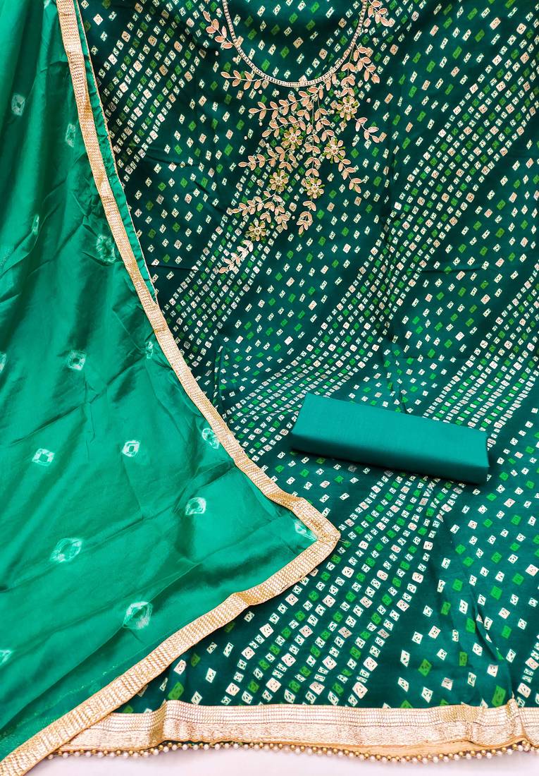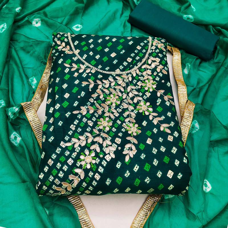 | Product Description | Fancy Lehariya Printed Top With Hand Work And Border With Bandhani Printed Dupatta Straight Style 1.90 Mtr Unstitched Dress Material Top Of Green Colour Premium Jam Cotton Fabric Also Including 2.10 Mtr Bottom Piece Material Of Green Colour Cotton Fabric With 2.00 Mtr Dupatta Of Green Colour Nazneen Fabric |