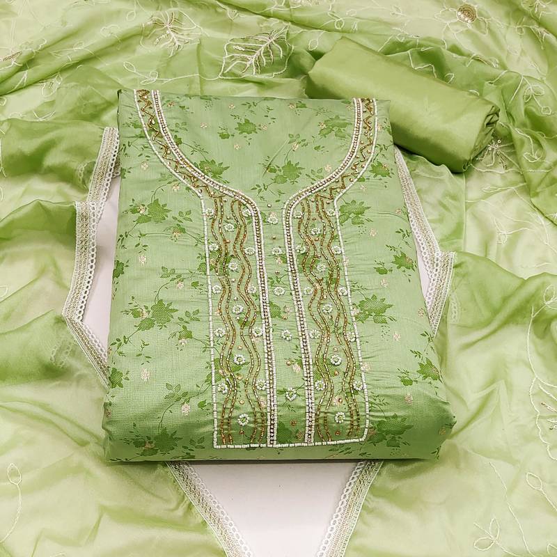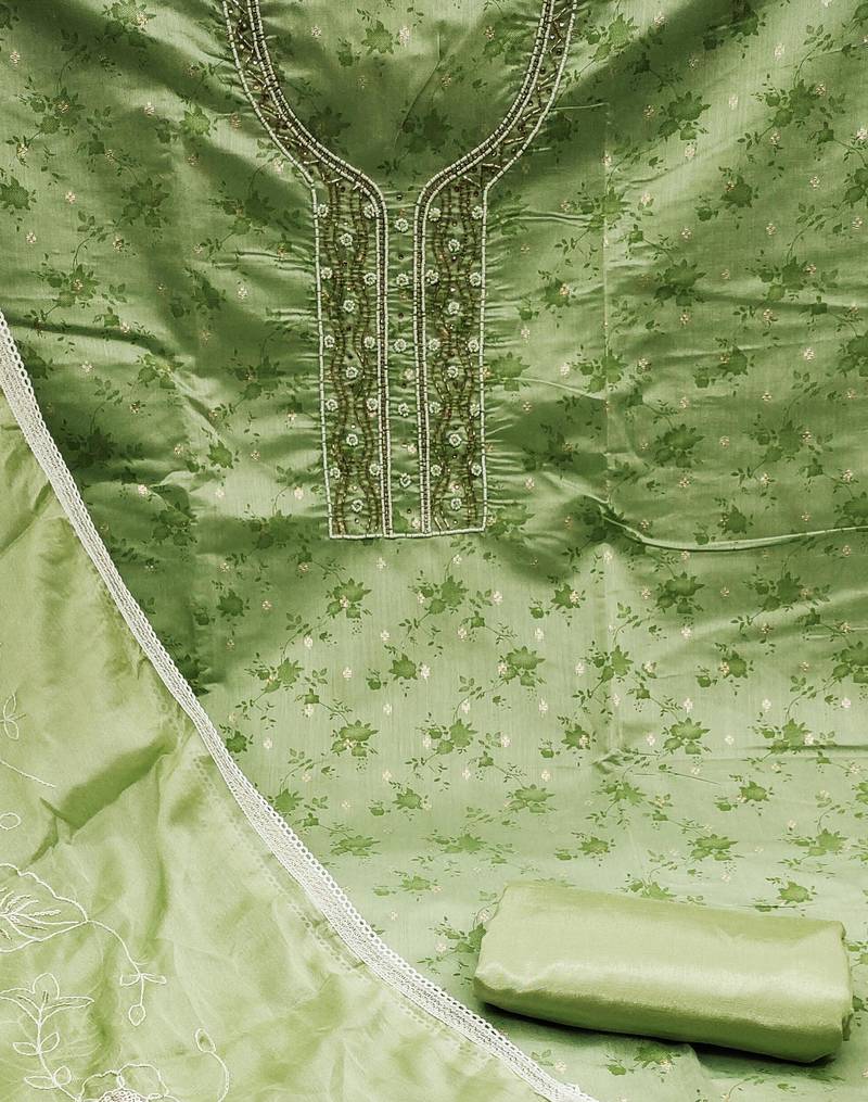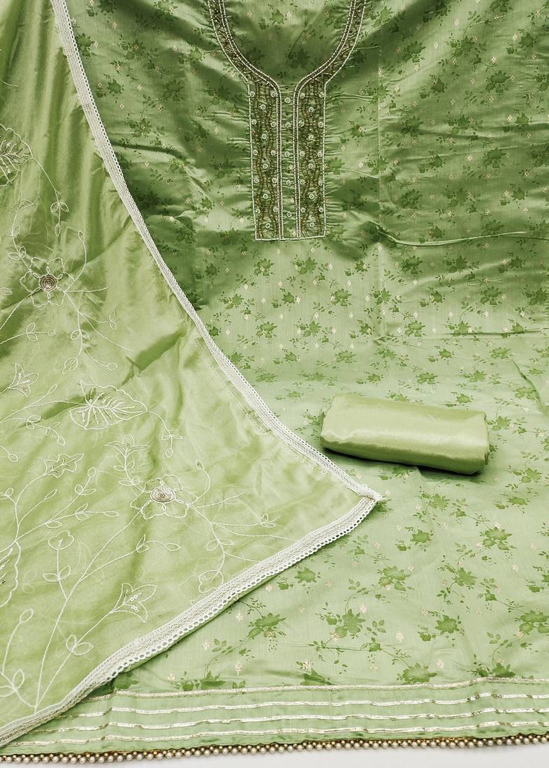| Product Description | Handwork Digital Print And Fancy Weaving Work With Embroidery Work Dupatta Straight Style 1.95 Mtr Unstitched Dress Material Top Of Pista Green Colour Cotton Jacquard Fabric With 2 Mtr Heavy Santoon As Lining Inner Fabric Also Including 3.80 Mtr Unstitched Bottom Material Of Green Colour Heavy Santoon Fabric With 2.05 Mtr Dupatta Of Green Colour Organza Fabric |