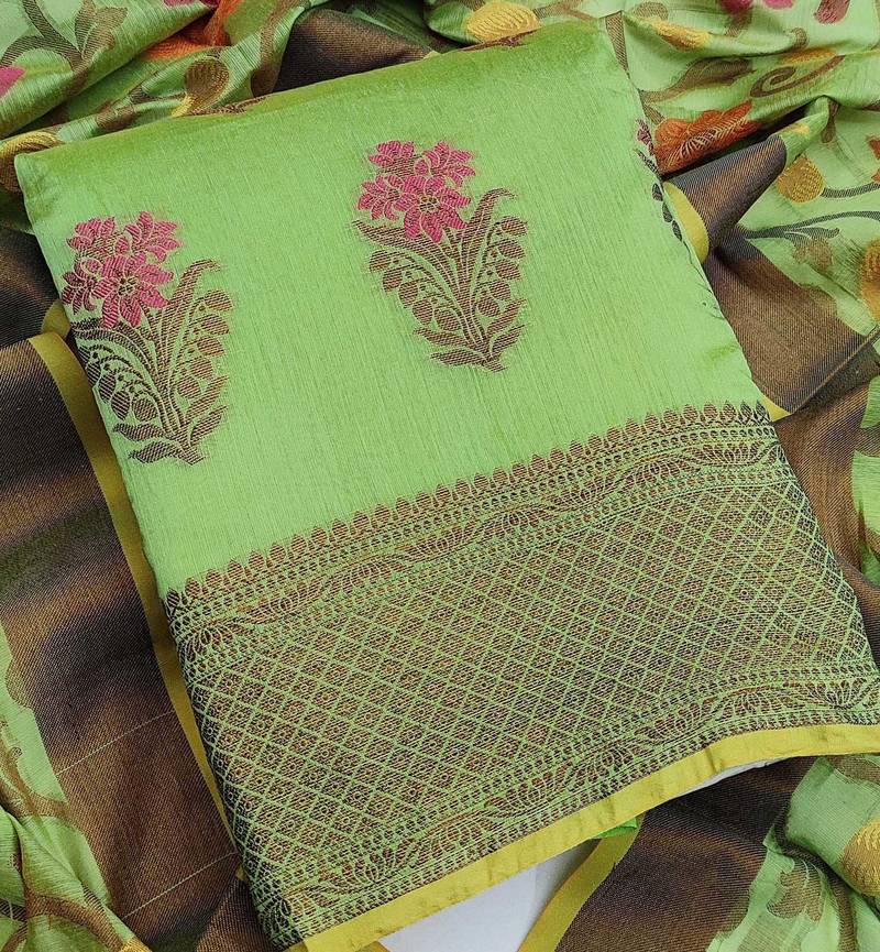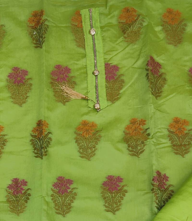 | Product Description | Weaving With Banarasi Jacquard Dupatta Straight Style 2.00 Mtr Unstitched Dress Material Top Of Green Colour Banarasi Jacquard Fabric Suggestable Quarter Style Sleeves And Round Style Neck Also Including 2.10 Mtr Chudidar Style Bottom Piece Material Of Green Colour Santoon Fabric With 2.00 Mtr Dupatta Of Green Colour Banarasi Jacquard Fabric |
