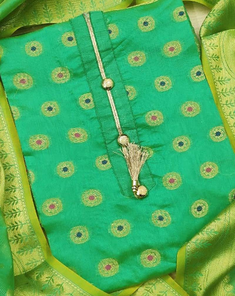 | Product Description | Weaving With Banarasi Jacquard Dupatta Straight Style 2.00 Mtr Unstitched Dress Material Top Of Green Colour Banarasi Jacquard Fabric Suggestable Quarter Style Sleeves And Round Style Neck Also Including 2.10 Mtr Chudidar Style Bottom Piece Material Of Green Colour Santoon Fabric With 2.00 Mtr Dupatta Of Green Colour Banarasi Jacquard Fabric |