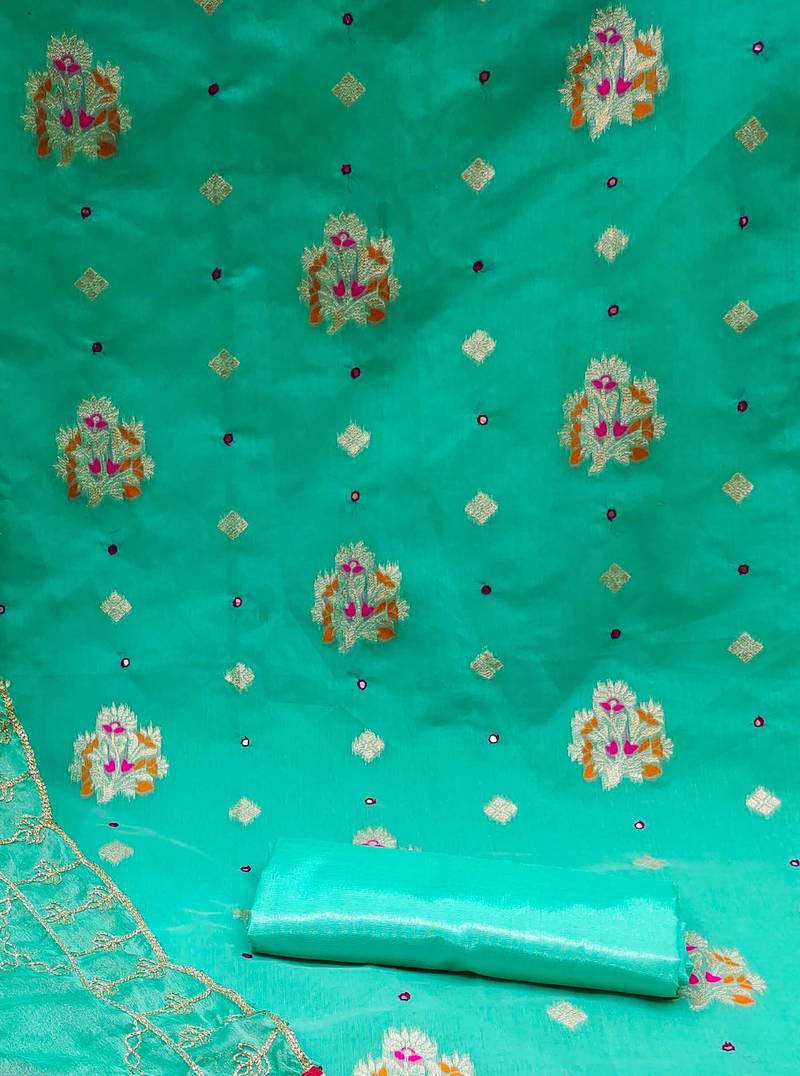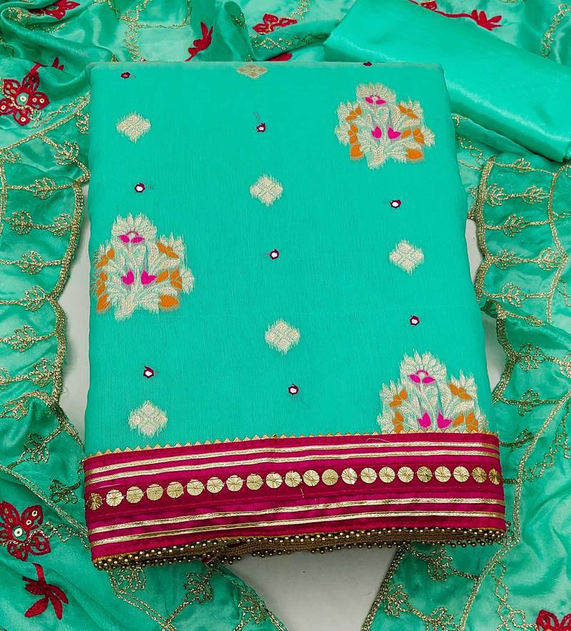 | Product Description | Charming Weaving And Mirror Work With Embroidered Dupatta Straight Style 1.90 Mtr Unstitched Dress Material Top Of Green Colour Banarasi Jacquard Fabric With 2 Mtr Santoon As Lining Inner Fabric Also Including 2.10 Mtr Unstitched Bottom Material Of Green Colour Santoon Fabric With 2.00 Mtr Dupatta Of Green Colour Nazneen Fabric |