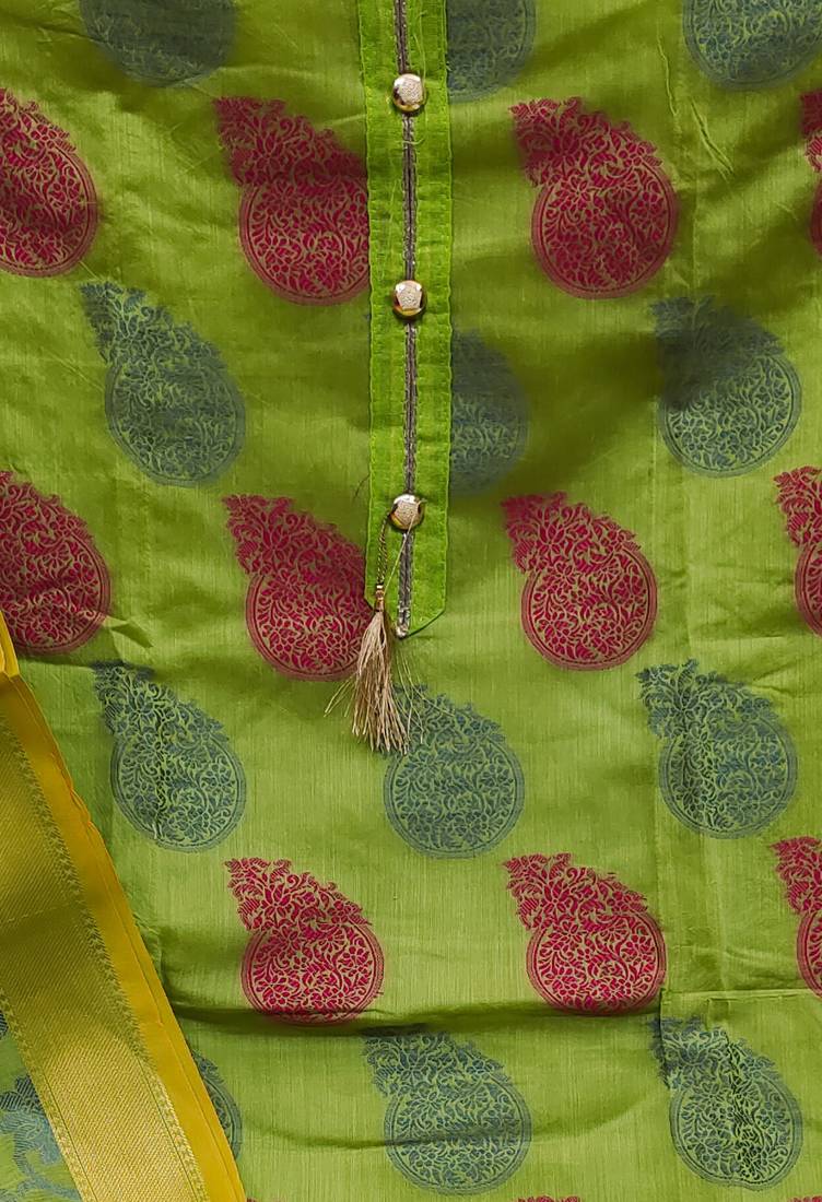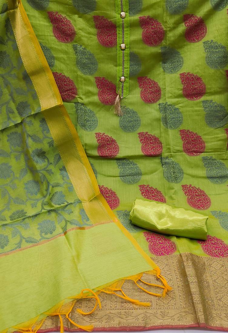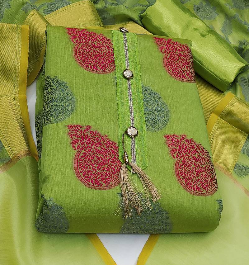 | Product Description | Weaving Straight Style 1.80 Mtr Unstitched Dress Material Top Of Green Colour Banarasi Jacquard Fabric Suggestable Quarter Style Sleeves And Round Style Neck Also Including 2.00 Mtr Chudidar Style Bottom Material Of Green Colour Santoon Fabric With 2.00 Mtr Dupatta Of Green Colour Banarasi Jacquard Fabric |