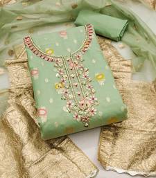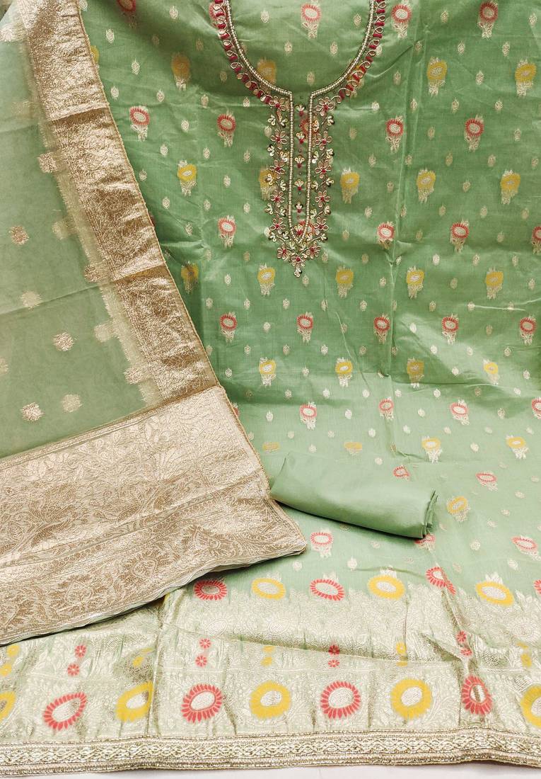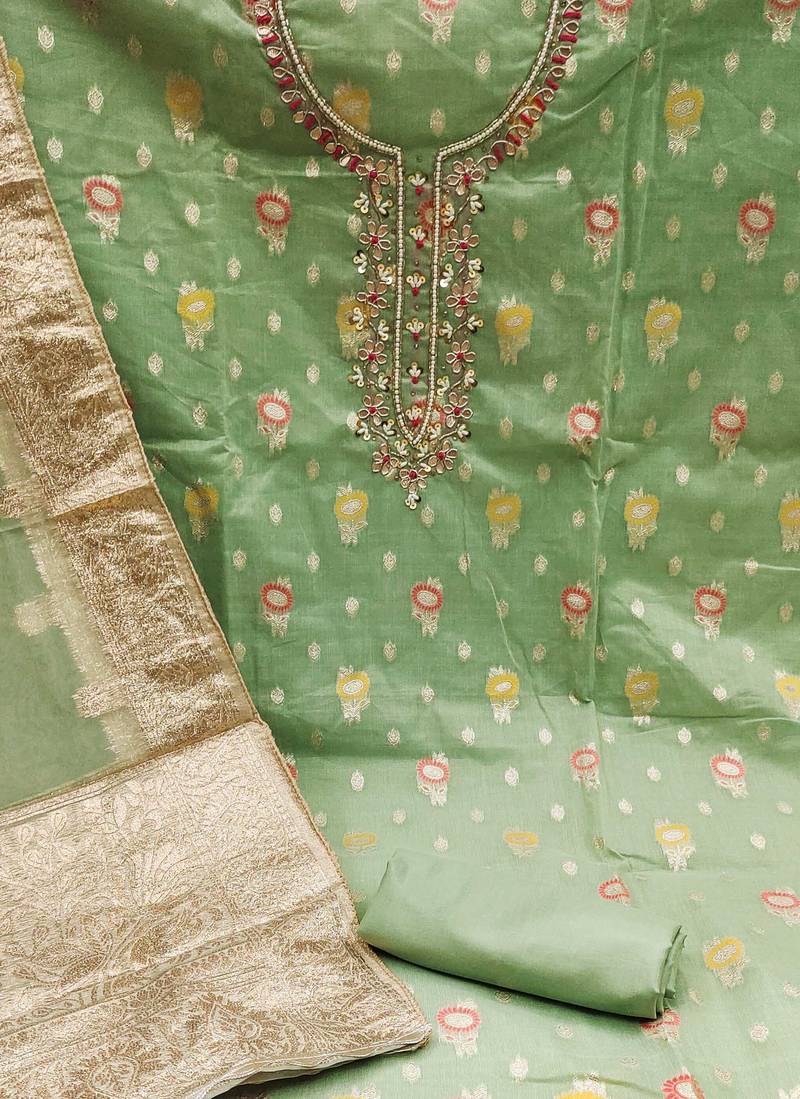| Product Description | Dashing Weaving Work With Heavy Neck Handwork And Border With Fancy Weaving Dupatta Work Straight Style 2.00 Mtr Unstitched Dress Material Top Of Green Colour Organza Jacquard Fabric With 2 Mtr Dull Santoon As Lining Inner Fabric Also Including 3.60 Mtr Unstitched Bottom Material Of Green Colour Dull Santoon Fabric With 2.05 Mtr Dupatta Of Green Colour Organza Banarasi Fabric |