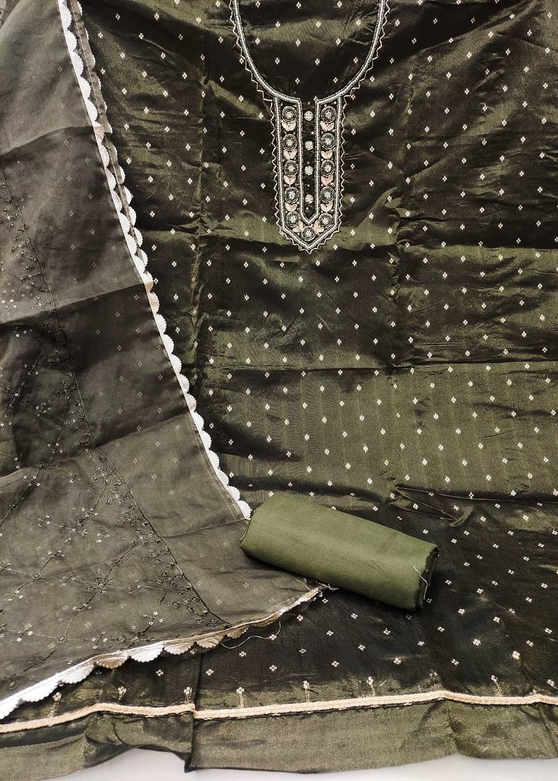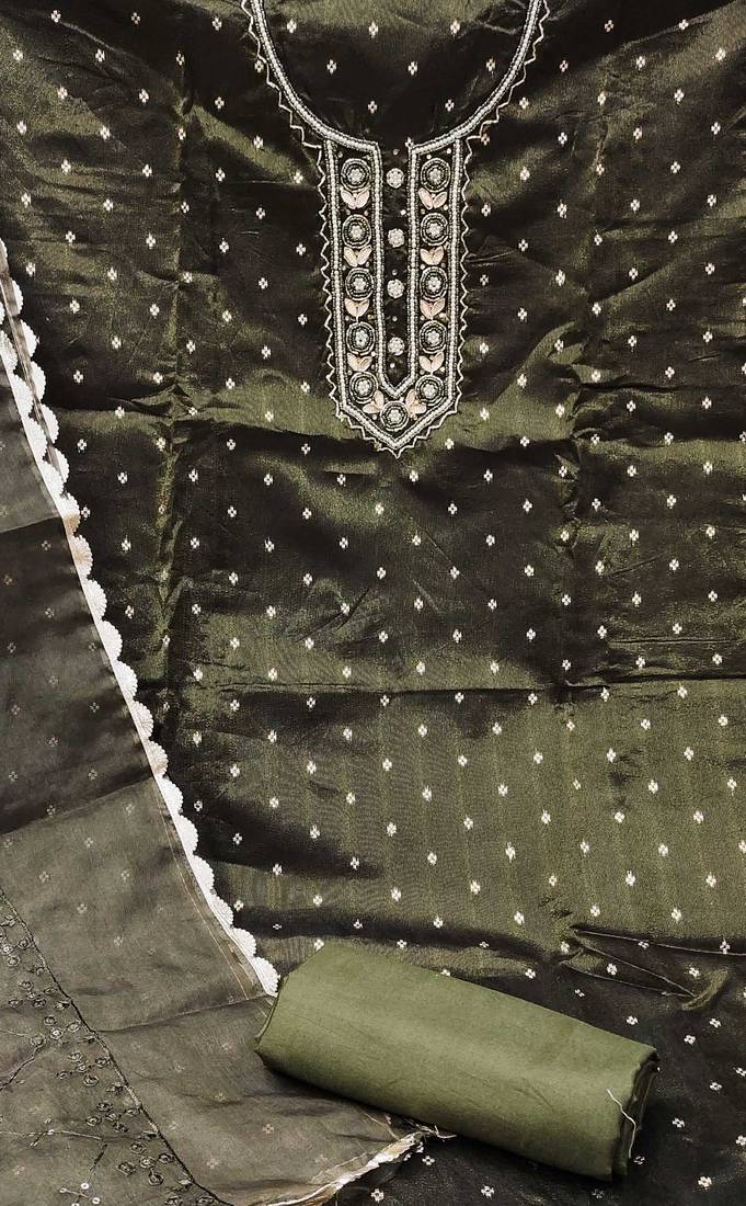 | Product Description | Weaving Work With Heavy Neck Handwork And Border With Fancy Sequin Embroidery Dupatta Work Straight Style 2.00 Mtr Unstitched Dress Material Top Of Green Colour Organza Jacquard Fabric With 2 Mtr Dull Santoon As Lining Inner Fabric Also Including 3.60 Mtr Unstitched Bottom Material Of Green Colour Dull Santoon Fabric With 2.05 Mtr Dupatta Of Green Colour Organza Fabric |