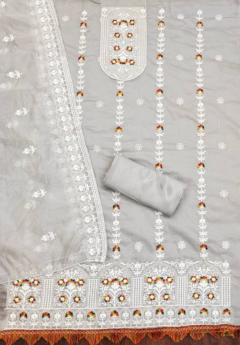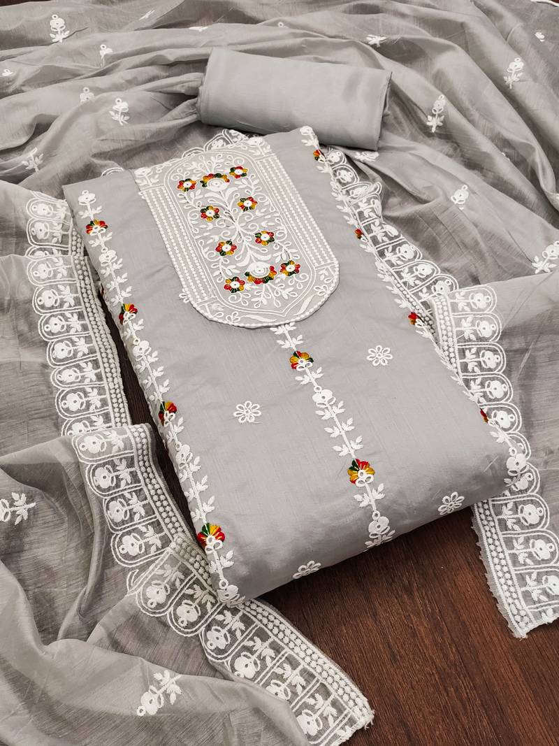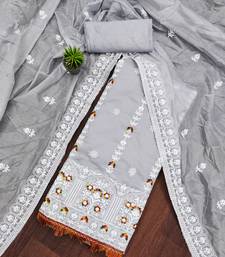 Grey cotton embroidered dress material unstitched