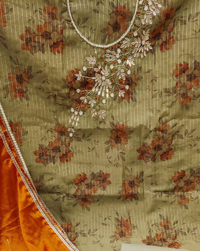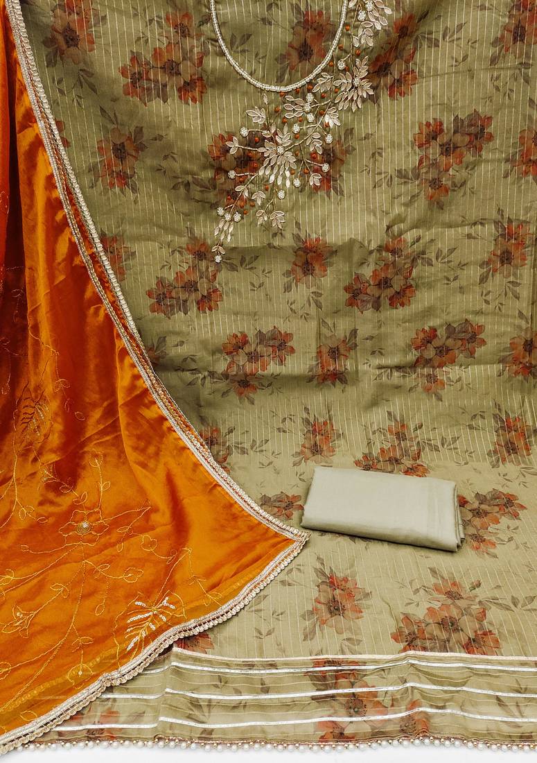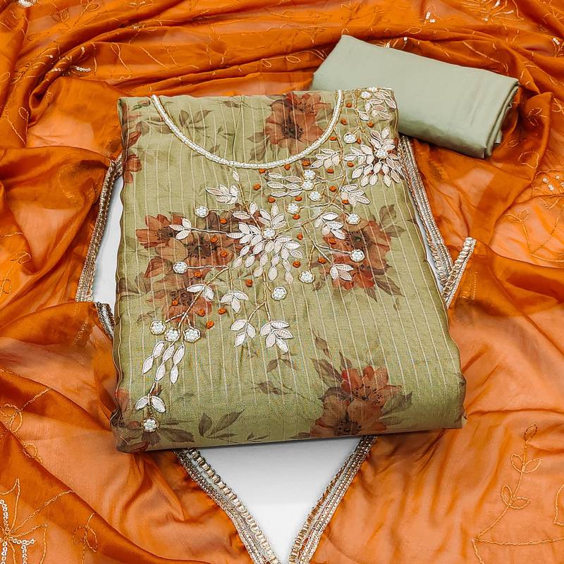 | Product Description | Digital Print Handwork And Fancy Border With Embroidered Dupatta Straight Style 1.90 Mtr Unstitched Dress Material Top Of Grey Colour Modal Banarasi Fabric With 2 Mtr Santoon As Lining Inner Fabric Also Including 3.60 Mtr Unstitched Bottom Material Of Grey Colour Santoon Fabric With 2.00 Mtr Dupatta Of Orange Colour Organza Fabric |