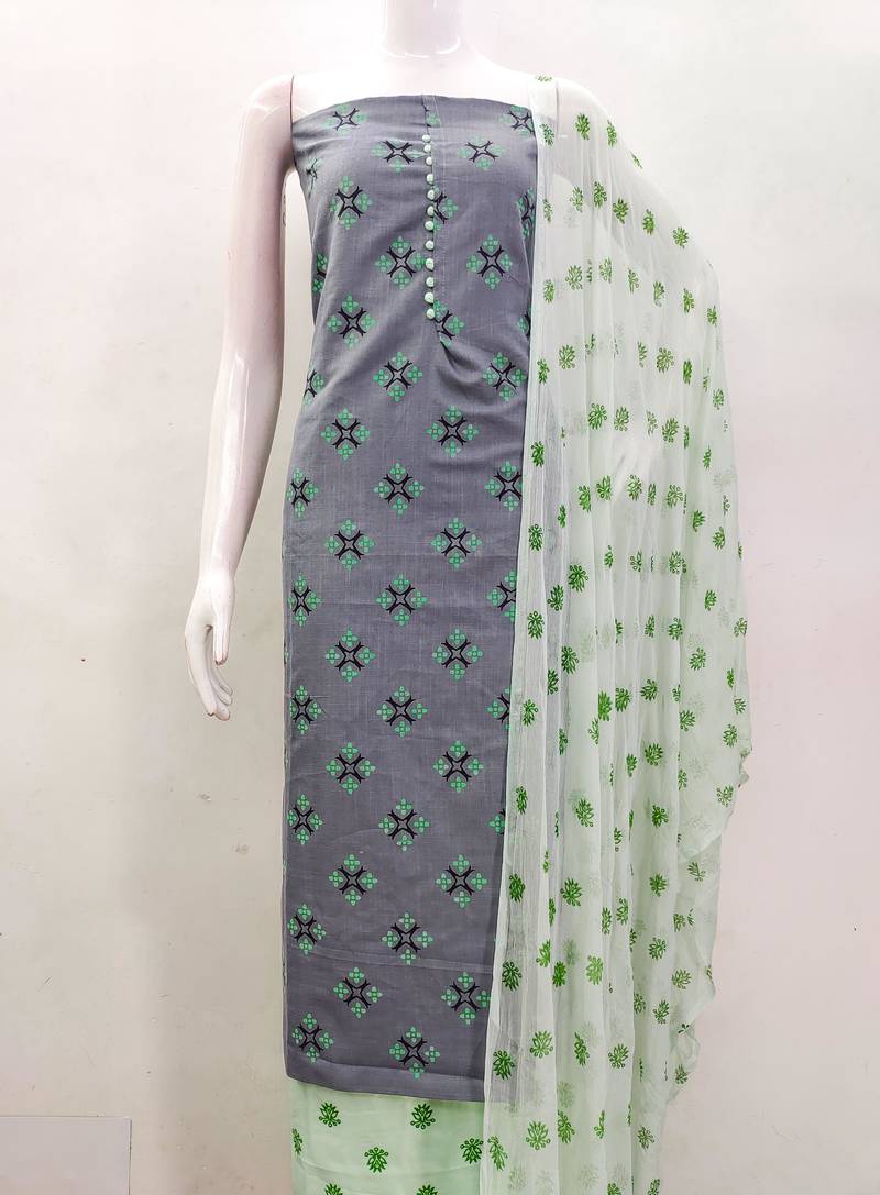 | Product Description | Print Straight Style 1.80 Mtr Unstitched Dress Material Top Of Grey Colour Slub Cotton Fabric Also Including 2.00 Mtr Chudidar Style Bottom Piece Material Of Green Colour Cotton Fabric With 2.00 Mtr Dupatta Of Green Colour Nazneen Fabric |