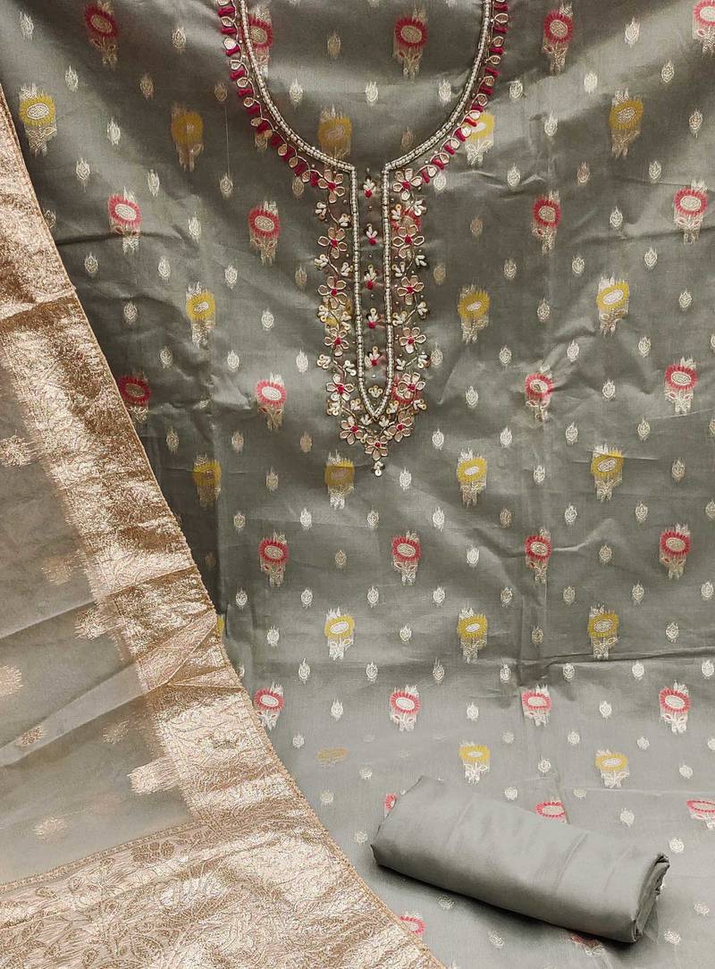 | Product Description | Simplistic Weaving Work With Heavy Neck Handwork And Border With Fancy Weaving Dupatta Work Straight Style 2.00 Mtr Unstitched Dress Material Top Of Grey Colour Organza Jacquard Fabric With 2 Mtr Dull Santoon As Lining Inner Fabric Also Including 3.60 Mtr Unstitched Bottom Material Of Grey Colour Dull Santoon Fabric With 2.05 Mtr Dupatta Of Grey Colour Organza Banarasi Fabric |