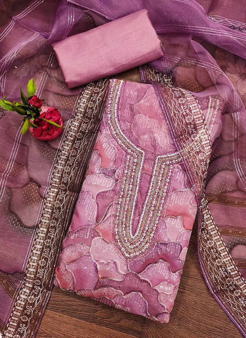 Lavender organza sequins dress material unstitched