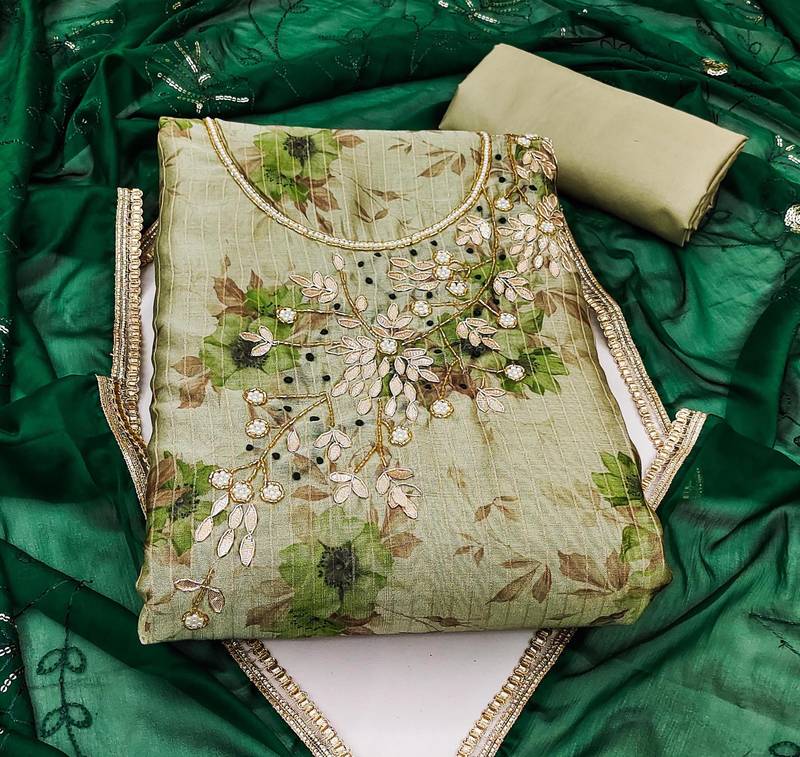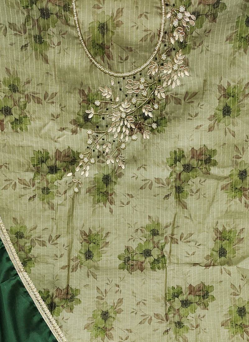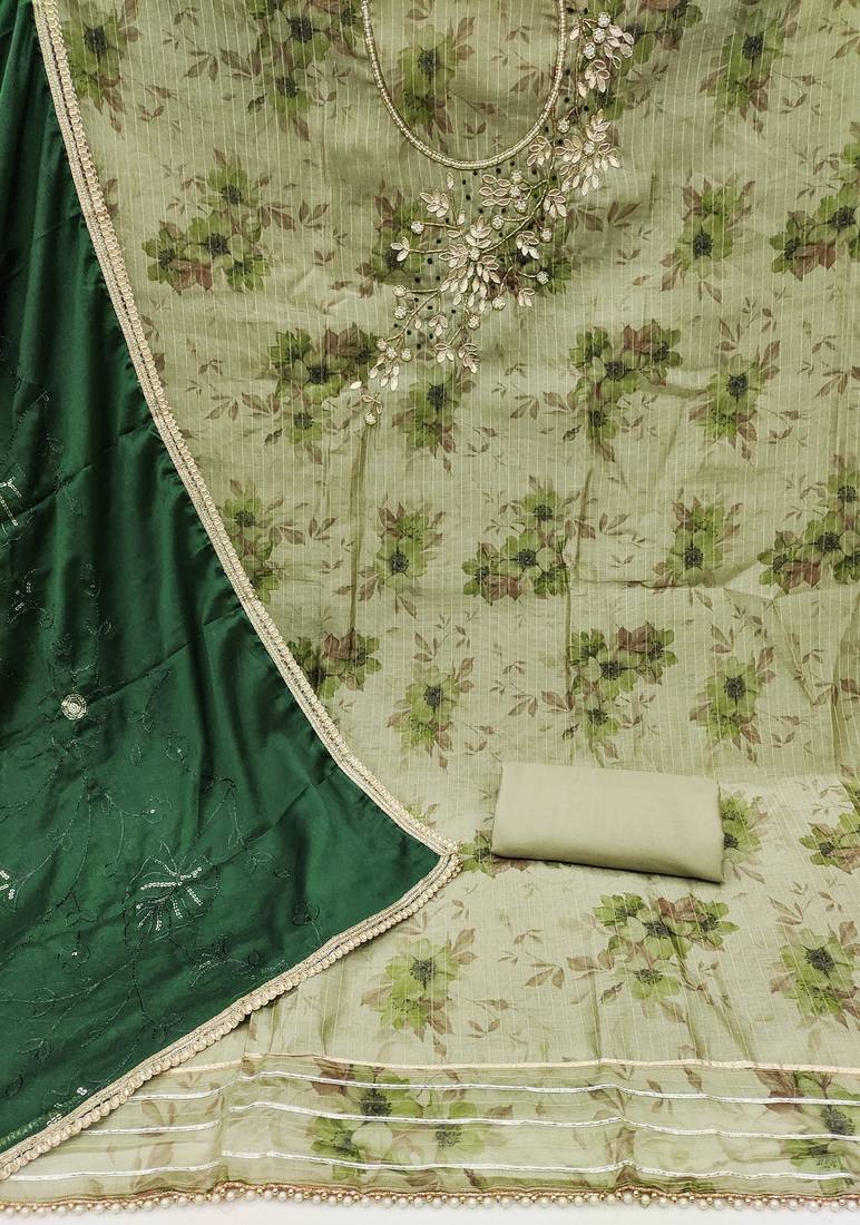 | Product Description | Digital Print Handwork And Fancy Border With Embroidered Dupatta Straight Style 1.90 Mtr Unstitched Dress Material Top Of Light Green Colour Modal Banarasi Fabric With 2 Mtr Santoon As Lining Inner Fabric Also Including 3.60 Mtr Unstitched Bottom Material Of Light Green Colour Santoon Fabric With 2.00 Mtr Dupatta Of Green Colour Organza Fabric |