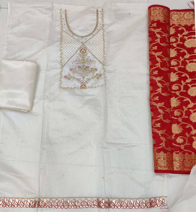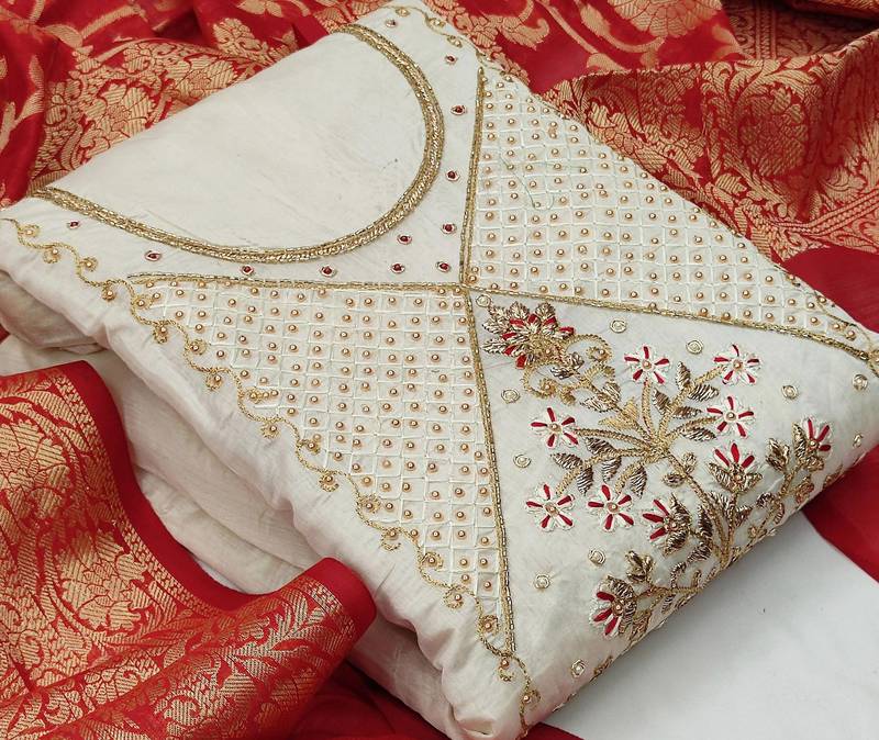 | Product Description | Fancy Fancy Hand Work With Banarasi Jacquard Dupatta Straight Style 2.00 Mtr Unstitched Dress Material Top Of Light Green Colour Modal Chanderi Handwork Fabric Suggestable Quarter Style Sleeves And Round Style Neck Also Including 2.10 Mtr Chudidar Style Bottom Piece Material Of Light Green Colour Santoon Fabric With 2.00 Mtr Dupatta Of Red Colour Banarasi Jacquard Fabric |