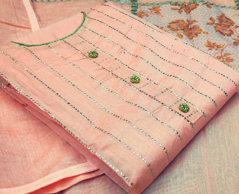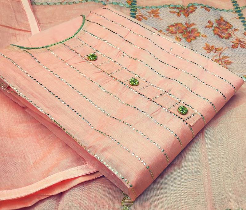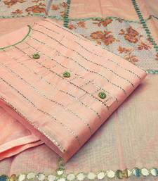 Light pink chanderi hand embroidery dress material unstitched