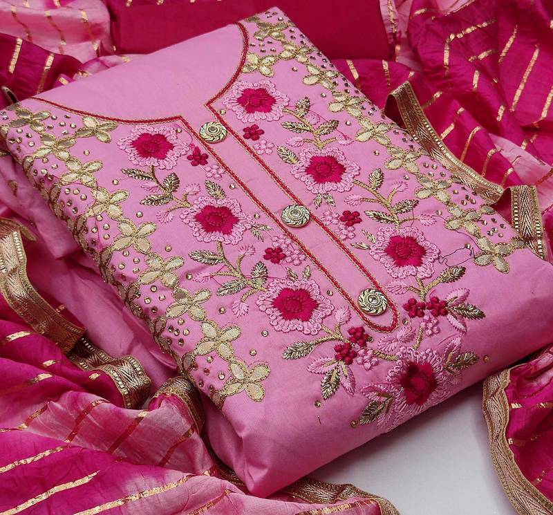 | Product Description | Beautifull Fancy Hand Work With Dupatta Straight Style 2.00 Mtr Unstitched Dress Material Top Of Light Pink Colour Glass Cotton Fabric Suggestable Quarter Style Sleeves And Round Style Neck Also Including 2.10 Mtr Chudidar Style Bottom Piece Material Of Pink Colour Cotton Fabric With 2.00 Mtr Dupatta Of Multi Colour Colour Banarasi Fabric |