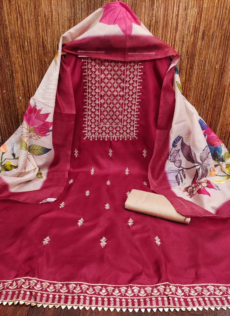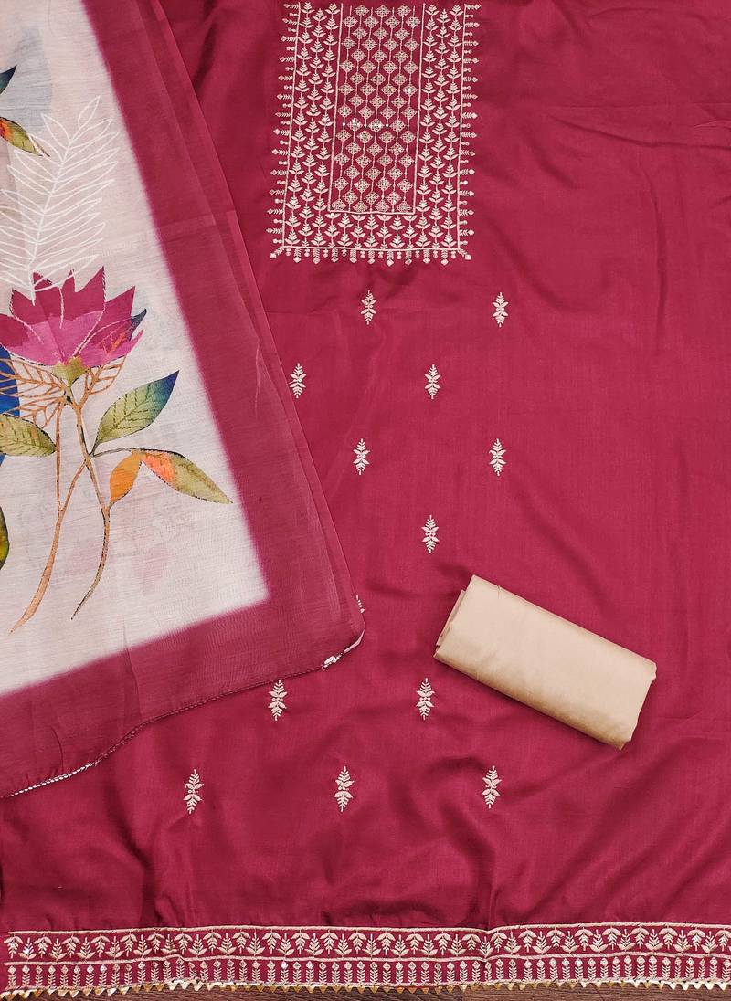 Magenta cotton embroidered dress material unstitched