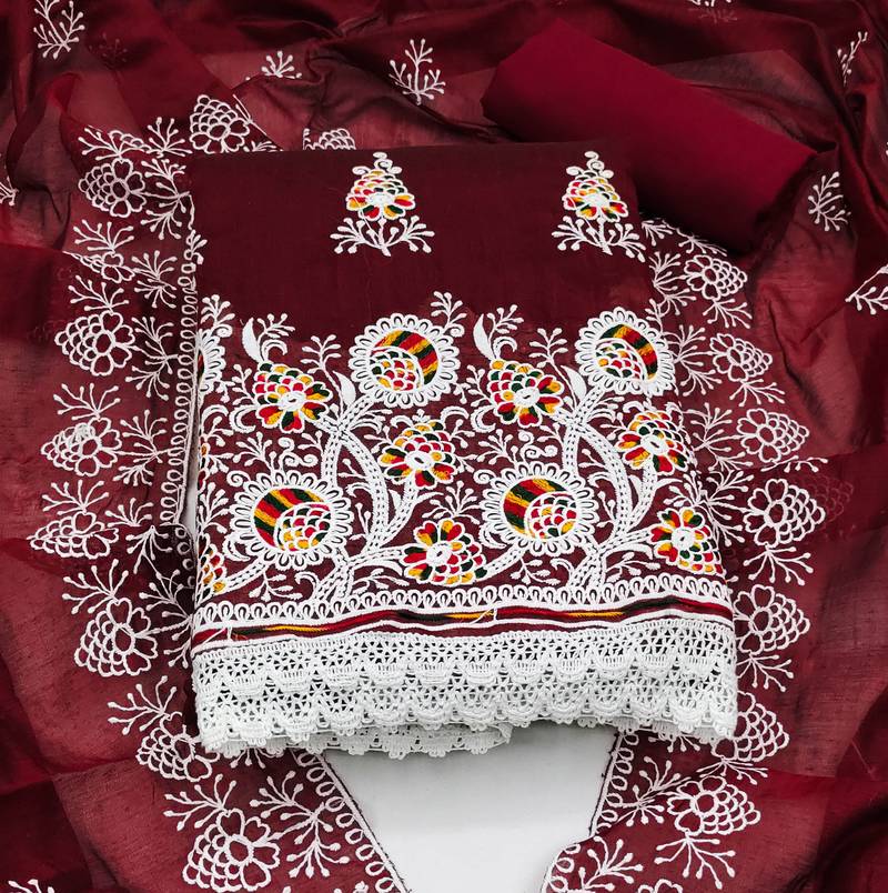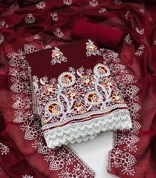 Maroon cotton embroidered dress material unstitched