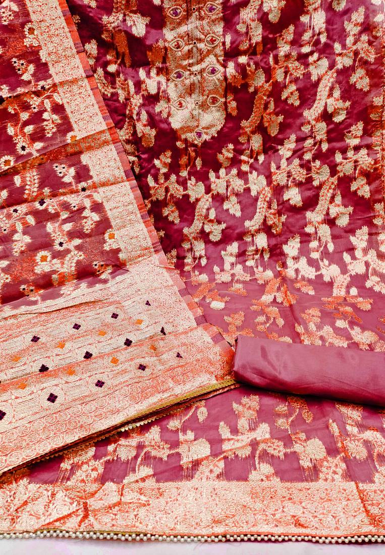 | Product Description | Fancy Handwork And Border With Weaving Dupatta Straight Style 2.25 Mtr Unstitched Dress Material Top Of Maroon Colour Organza Banarasi Fabric With 2 Mtr Santoon As Lining Inner Fabric Also Including 3.80 Mtr Unstitched Bottom Material Of Maroon Colour Santoon Fabric With 2.00 Mtr Dupatta Of Maroon Colour Banarasi Fabric |