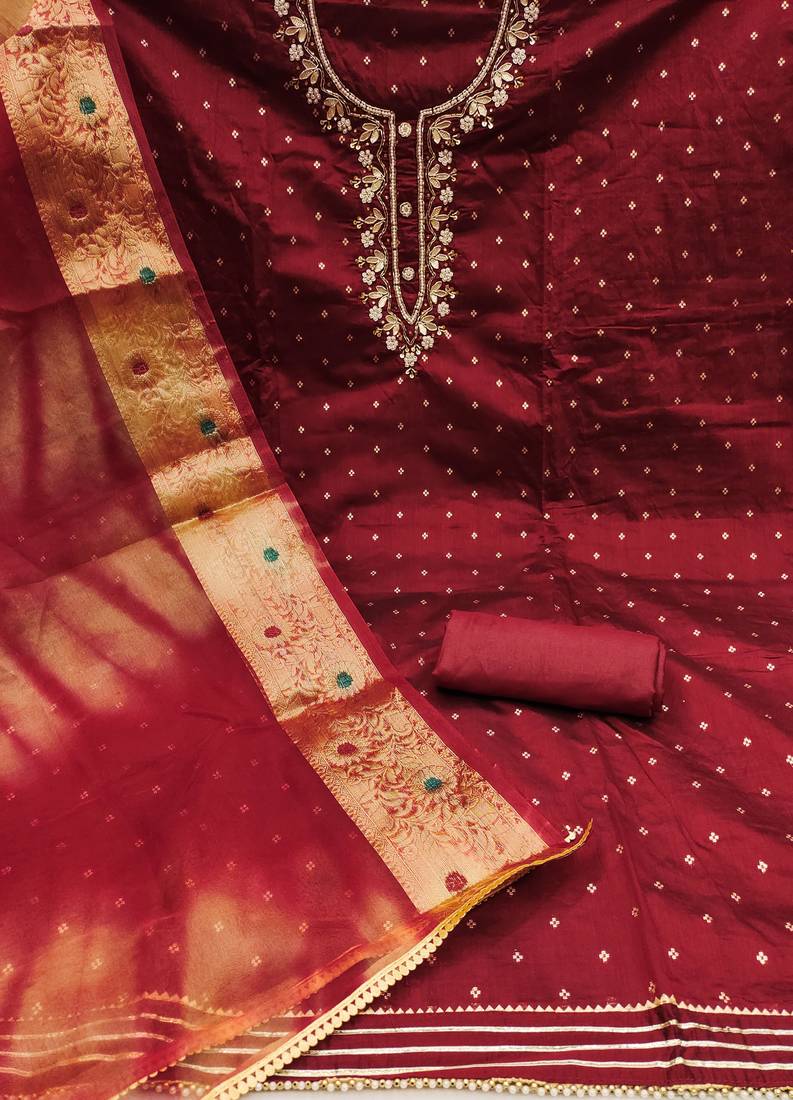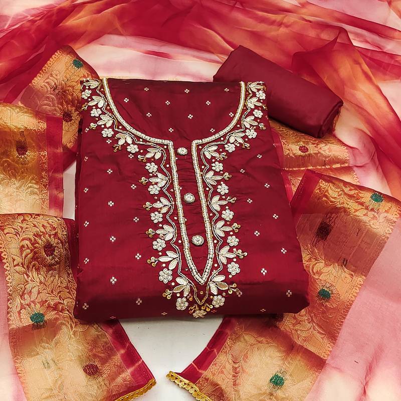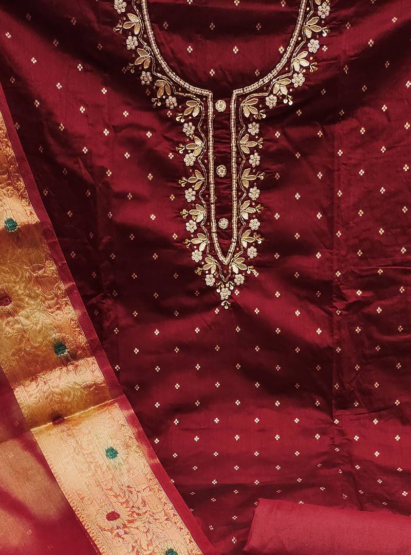 | Product Description | Banarasi Jari Weaving Work And Heavy Handwork With Printed Dupatta Straight Style 1.95 Mtr Unstitched Dress Material Top Of Maroon Colour Cotton Jacquard Fabric With 2 Mtr Heavy Santoon As Lining Inner Fabric Also Including 3.80 Mtr Unstitched Bottom Material Of Maroon Colour Heavy Santoon Fabric With 2.05 Mtr Dupatta Of Multi Colour Organza Jacquard Fabric |