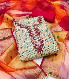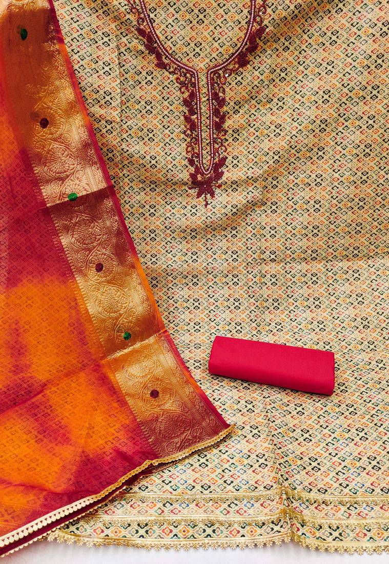 | Product Description | Appealing Hand Work Print And Fancy Border With Banarasi Dupatta Straight Style 1.80 Mtr Unstitched Dress Material Top Of Multi Colour Cotton Fabric Also Including 2.10 Mtr Bottom Piece Material Of Red Colour Cotton Fabric With 2.00 Mtr Dupatta Of Multi Colour Soft Banarasi Oranganja Fabric |
