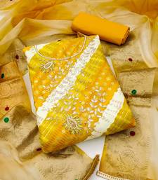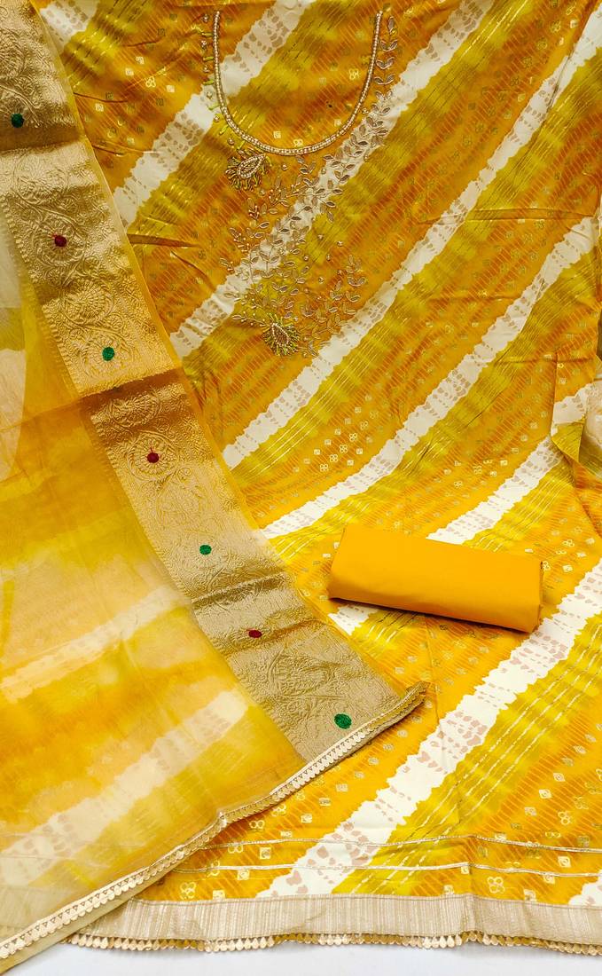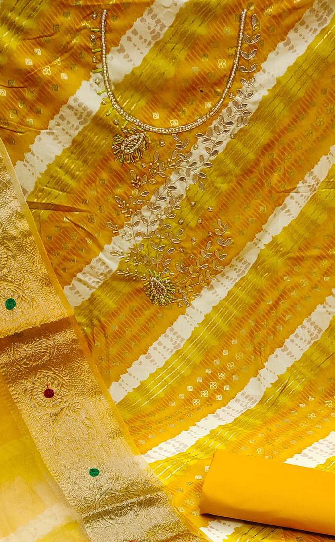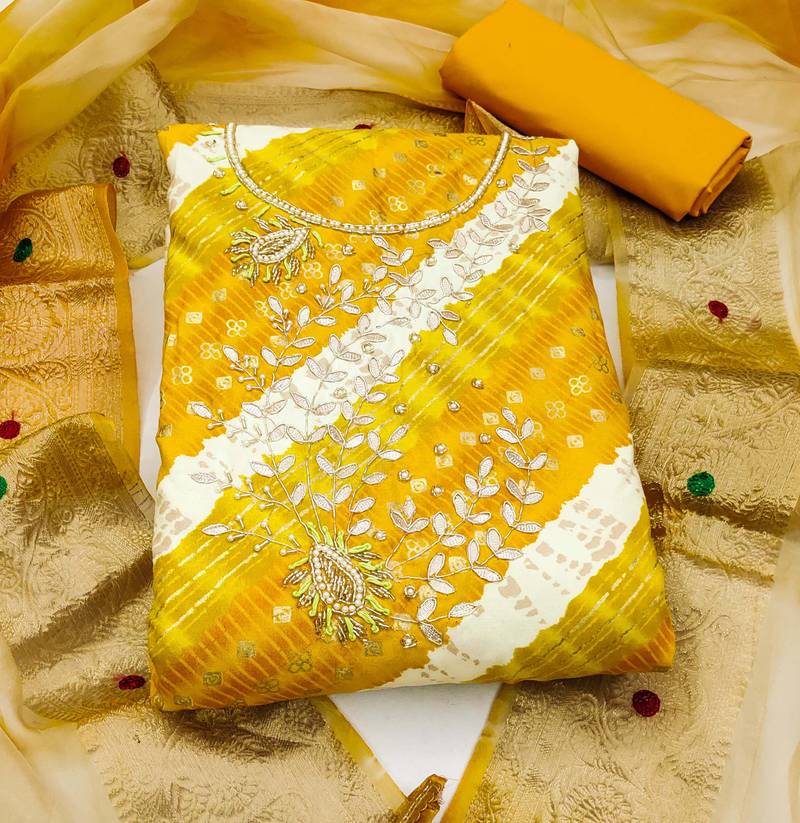 | Product Description | Appealing Fancy Lehariya Printed Top With Hand Work Foil Print And Border With Printed Banarasi Dupatta Straight Style 1.90 Mtr Unstitched Dress Material Top Of Multi Colour Premium Jam Cotton Fabric Also Including 2.10 Mtr Bottom Piece Material Of Yellow Colour Cotton Fabric With 2.00 Mtr Dupatta Of Multi Colour Soft Banarshi Oranganja Fabric |
