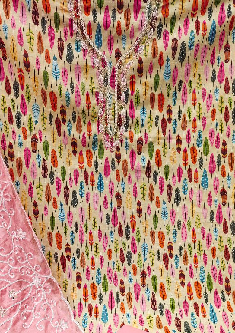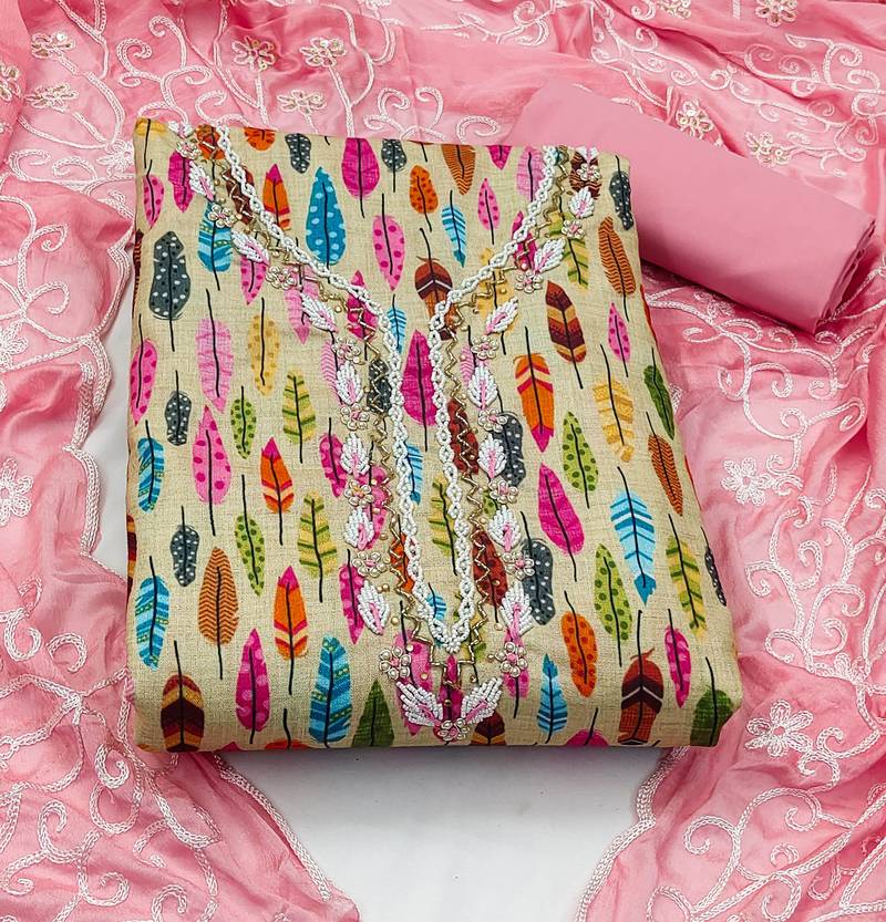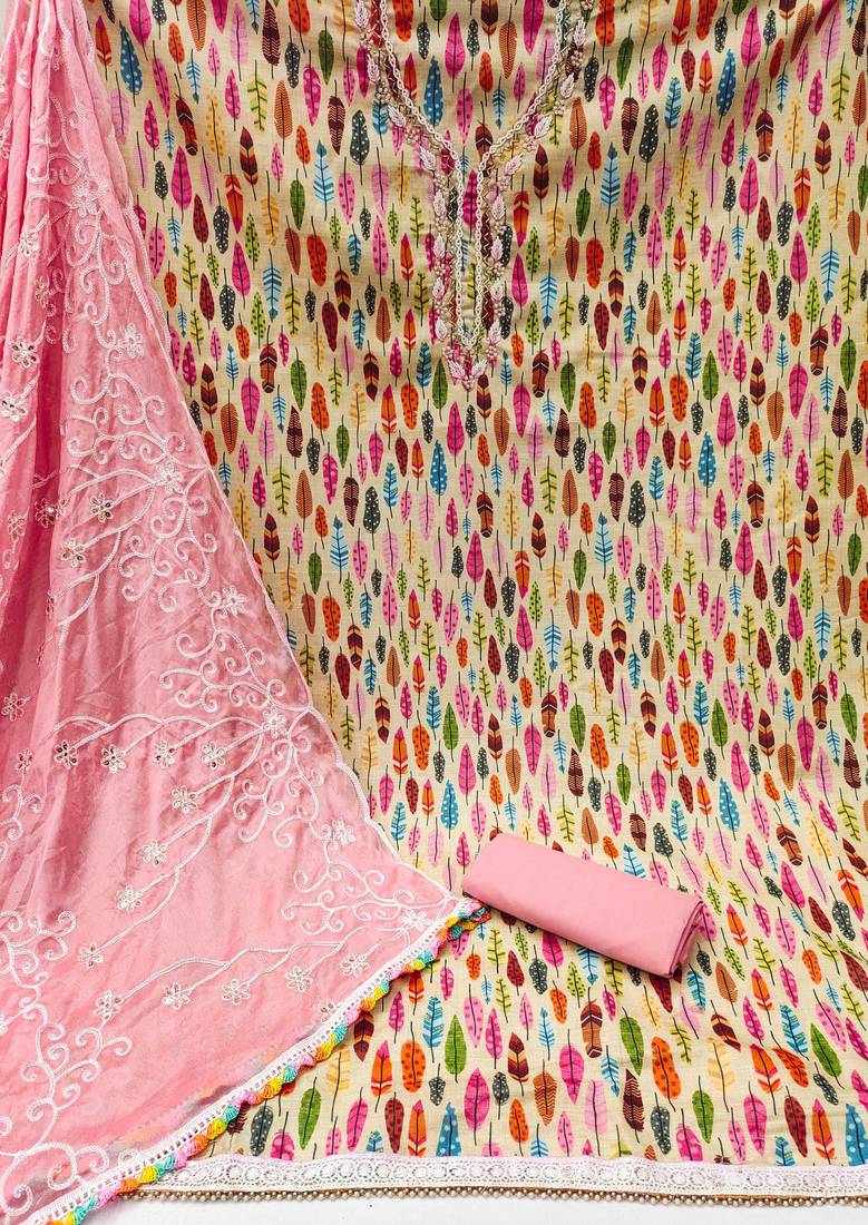 | Product Description | Amazing Fancy Hand Work Heavy Border And Print With Embroidered Dupatta Straight Style 1.80 Mtr Unstitched Dress Material Top Of Multi Colour Glass Cotton Fabric Also Including 2.00 Mtr Chudidar Style Bottom Piece Material Of Pink Colour Cotton Fabric With 2.00 Mtr Dupatta Of Pink Colour Nazneen Fabric |