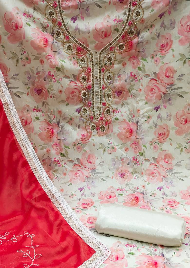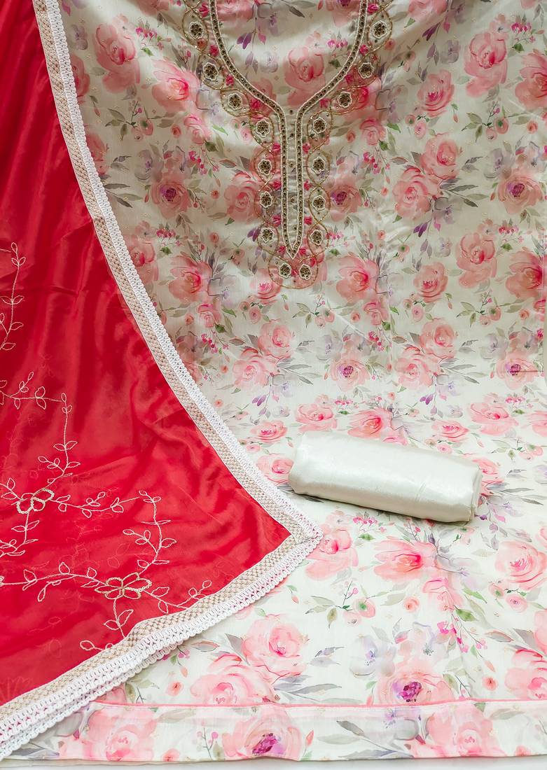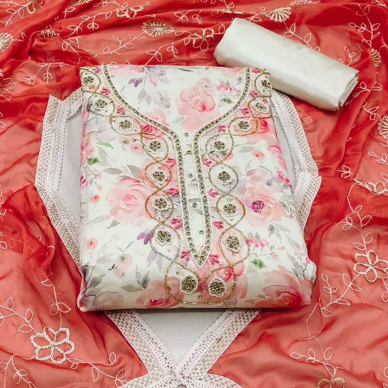 | Product Description | Print Hand Work And Fancy Border With Embroidered Dupatta Straight Style 1.95 Mtr Unstitched Dress Material Top Of Multi Colour Modal Cotton Fabric With 2 Mtr Santoon As Lining Inner Fabric Also Including 3.80 Mtr Unstitched Bottom Material Of Cream Colour Santoon Fabric With 2.05 Mtr Dupatta Of Orange Colour Organza Fabric |