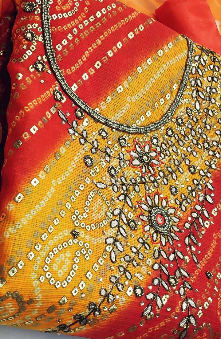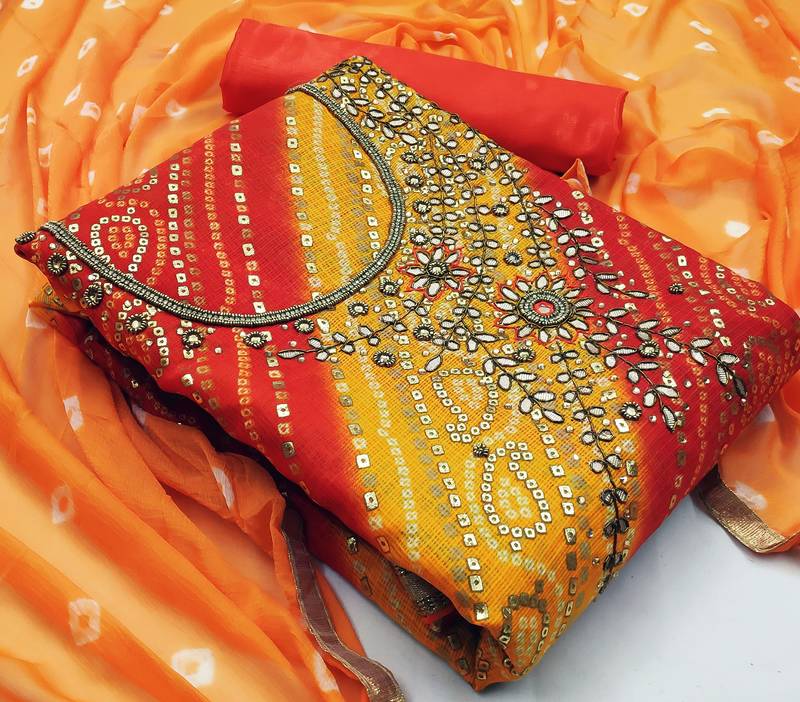 | Product Description | Fancy Hand Work With Bandhani Print Dupatta Straight Style 2.00 Mtr Unstitched Dress Material Top Of Multi Colour Colour Cotton Jacquard Fabric Suggestable Quarter Style Sleeves And Round Style Neck Also Including 2.10 Mtr Chudidar Style Bottom Piece Material Of Orange Colour Santoon Fabric With 2.00 Mtr Dupatta Of Yellow Colour Nazneen Fabric |