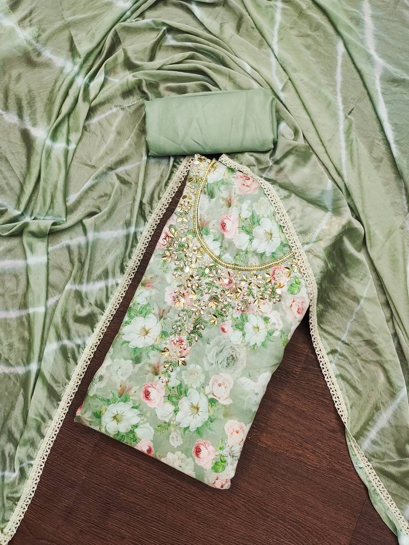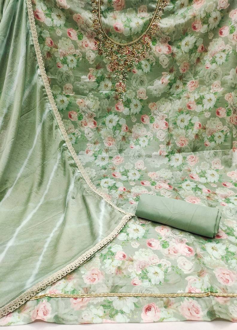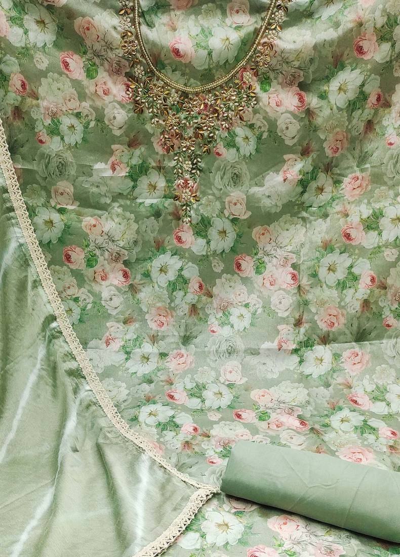 | Product Description | Simplistic Fancy Digital Print Work With Hand Work And Border With Printed Dupatta Work Straight Style 2.00 Mtr Unstitched Dress Material Top Of Multi Colour Maslin Cotton Fabric With 2 Mtr Dull Santoon As Lining Inner Fabric Also Including 3.60 Mtr Unstitched Bottom Material Of Green Colour Dull Santoon Fabric With 2.05 Mtr Dupatta Of Green Colour Nazneen Fabric |