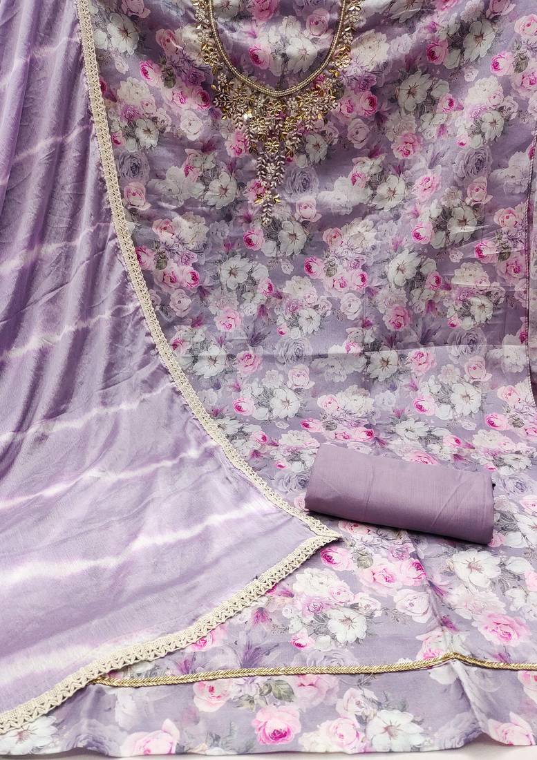 | Product Description | Fancy Digital Print Work With Hand Work And Border With Printed Dupatta Work Straight Style 2.00 Mtr Unstitched Dress Material Top Of Multi Colour Maslin Cotton Fabric With 2 Mtr Dull Santoon As Lining Inner Fabric Also Including 3.60 Mtr Unstitched Bottom Material Of Purple Colour Dull Santoon Fabric With 2.05 Mtr Dupatta Of Purple Colour Nazneen Fabric |