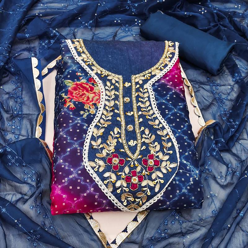 | Product Description | Fancy Handwork Sequin Work Position Print Work And Border With Weaving Dupatta Straight Style 2.00 Mtr Unstitched Dress Material Top Of Multi Colour Organza Fabric With 2 Mtr Santoon As Lining Inner Fabric Also Including 3.80 Mtr Unstitched Bottom Material Of Blue Colour Santoon Fabric With 2.00 Mtr Dupatta Of Blue Colour Nazneen Fabric |